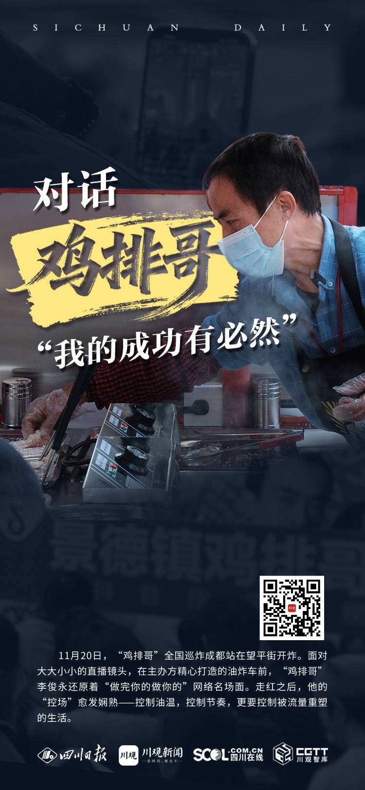 11月20日,“鸡排哥”全国巡炸成都站在望平街“开炸”。面对大大小小的直播镜头,在主办方精心打造的油炸车前,“鸡排哥”李俊永还原着“做完你的做你的”网络名场面。走红之后,他的“控场”愈发娴熟——控制油温,控制节奏,更要控制被流量重塑的生活。
