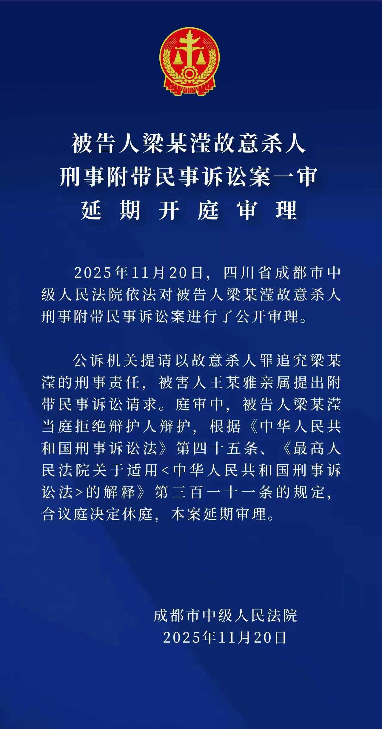 据成都市中级人民法院11月20日晚消息,被告人梁某滢故意杀人刑事附带民事诉讼案一审延期开庭审理。