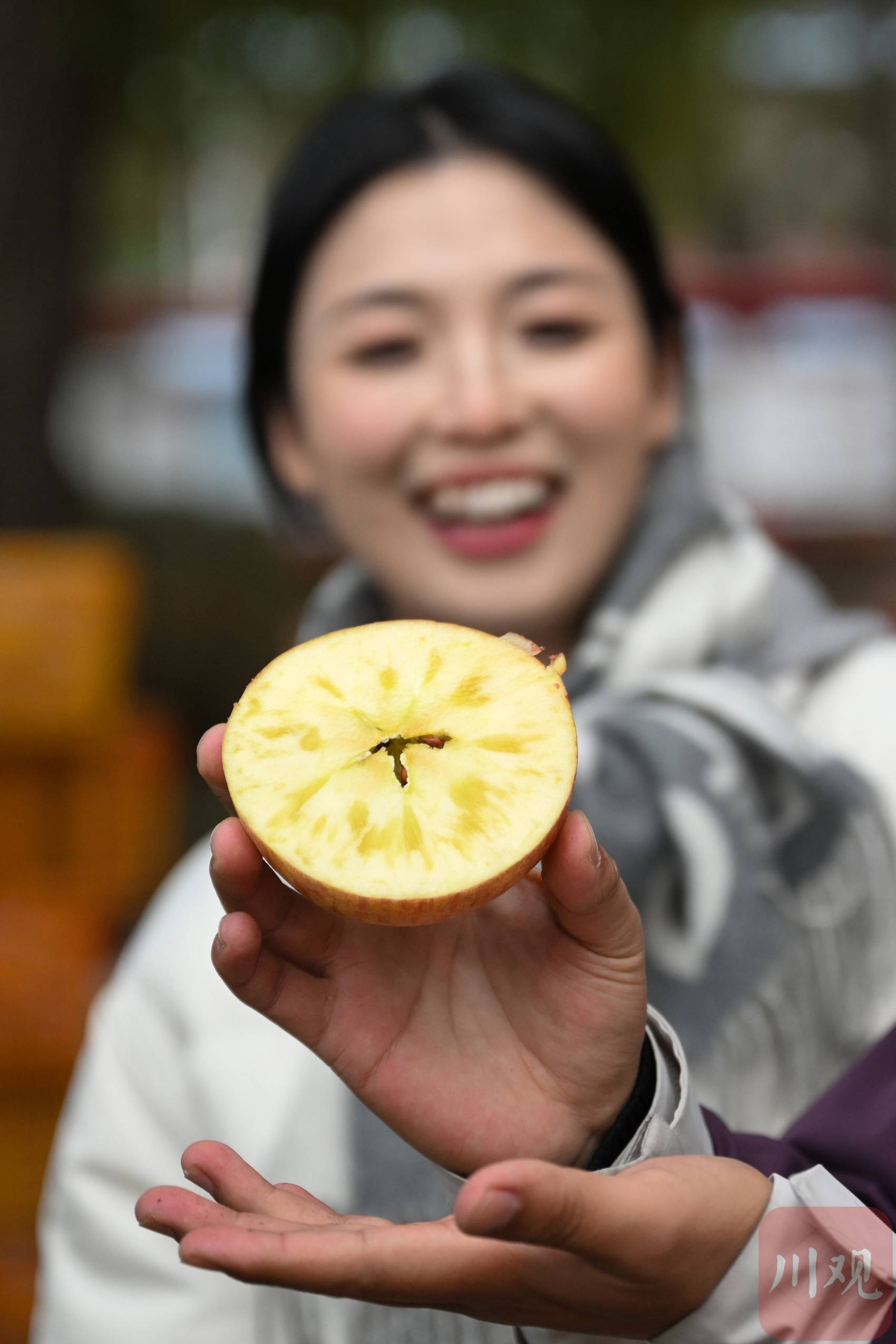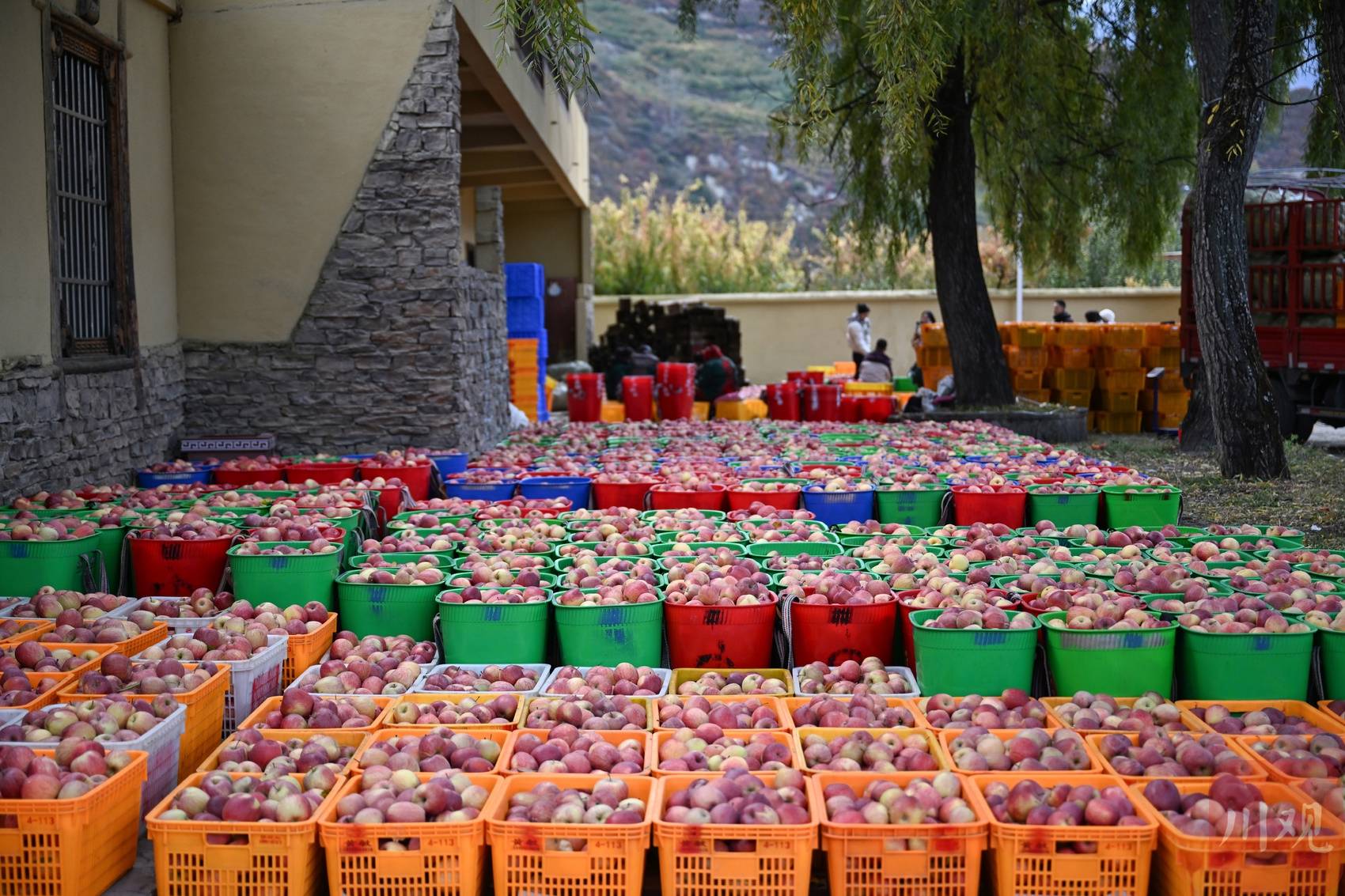 距离果园三公里外的村庄里,电商达人王光强和妻子黄月正对着手机屏幕热情推介:“朋友们,来开个‘盲盒’,看看您收到的苹果有没有糖心!”他们身后,数百筐新鲜采摘的苹果铺满场地,工作人员正有条不紊地包装、整理,为发货做足准备。