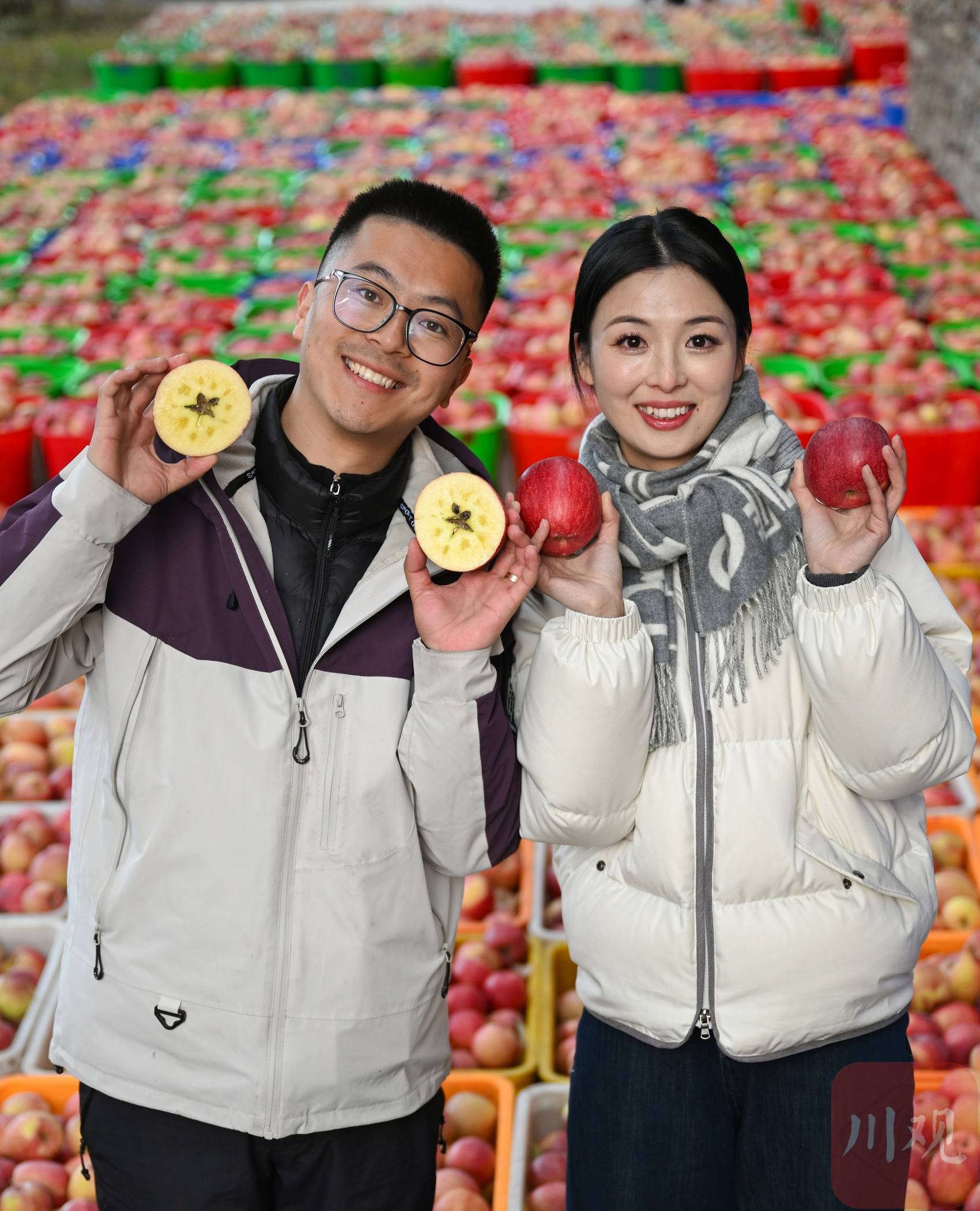 茂县南新镇的电商达人王光强夫妇正在直播,向网友介绍糖心苹果。
