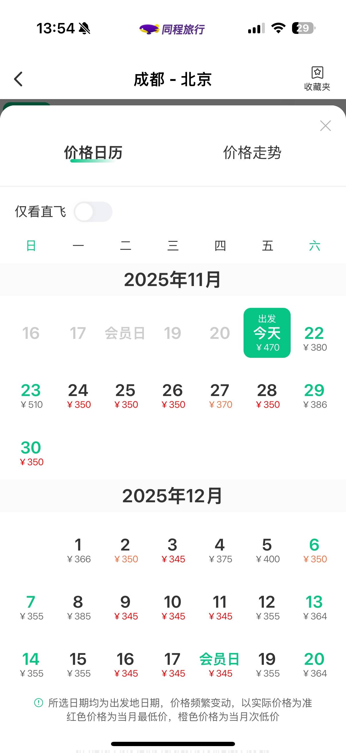 未来一个月,从成都到北京的机票价格。(同程旅行App截图)