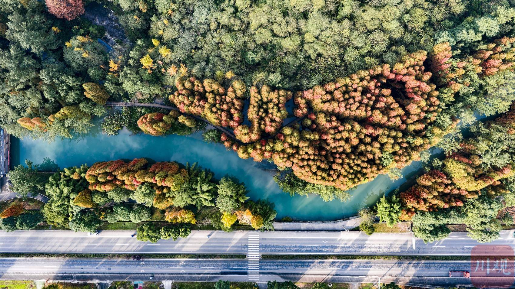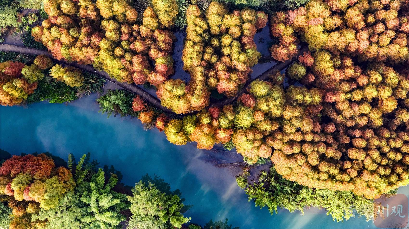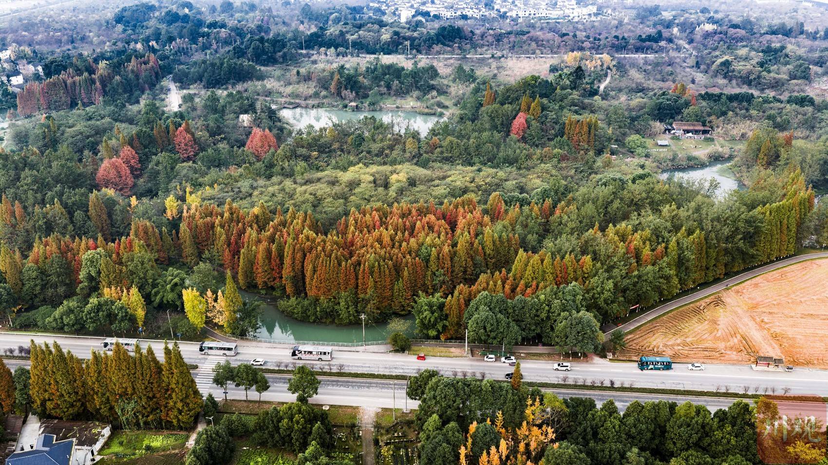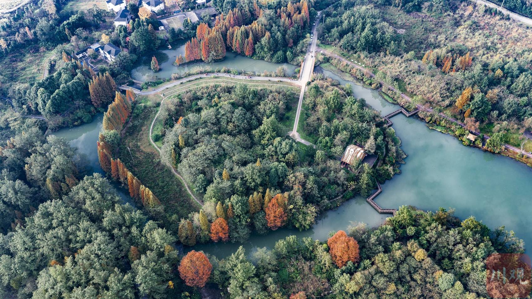 桤木河湿地公园水杉林金黄、橙红、深红交织,美轮美奂。