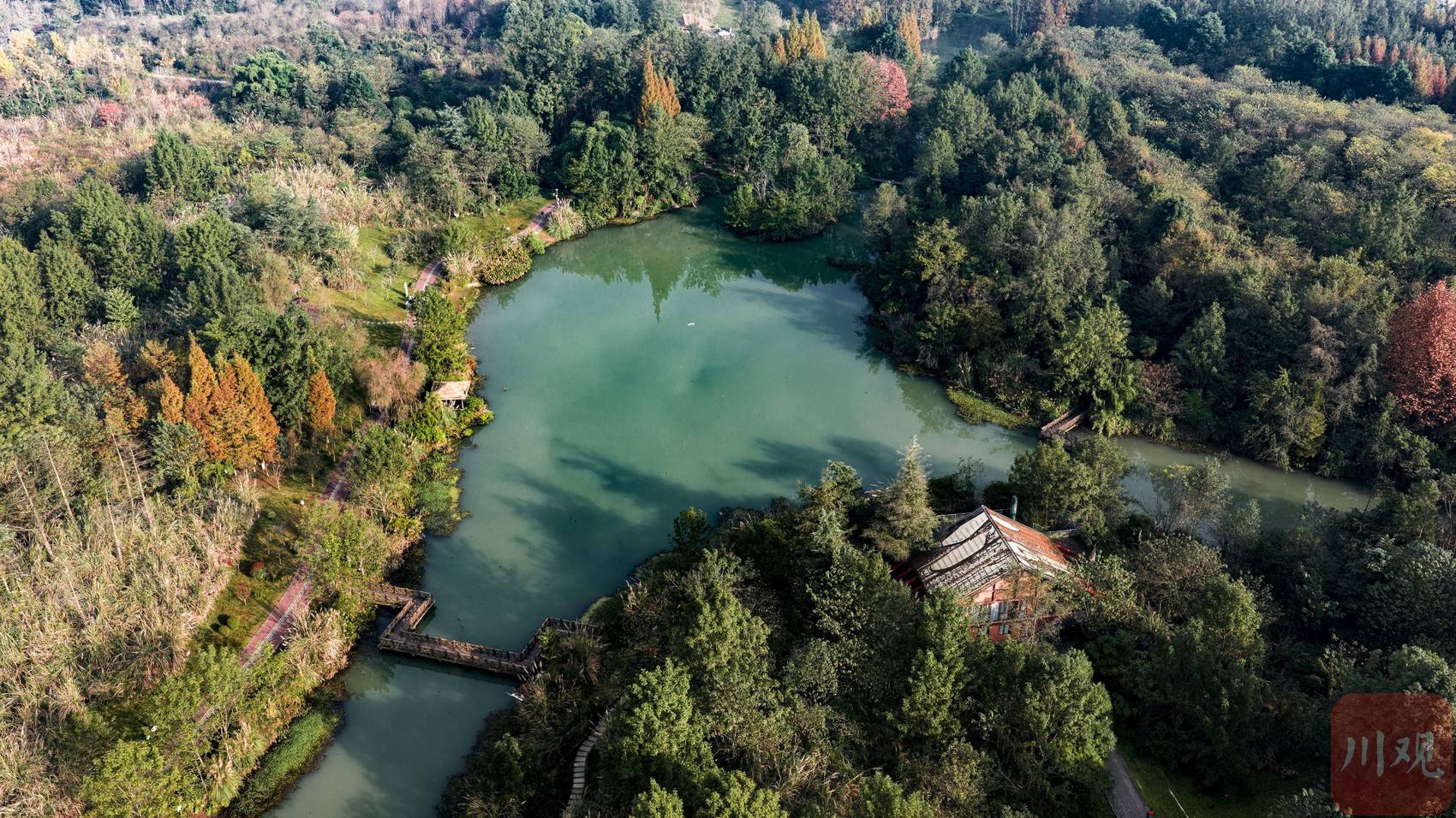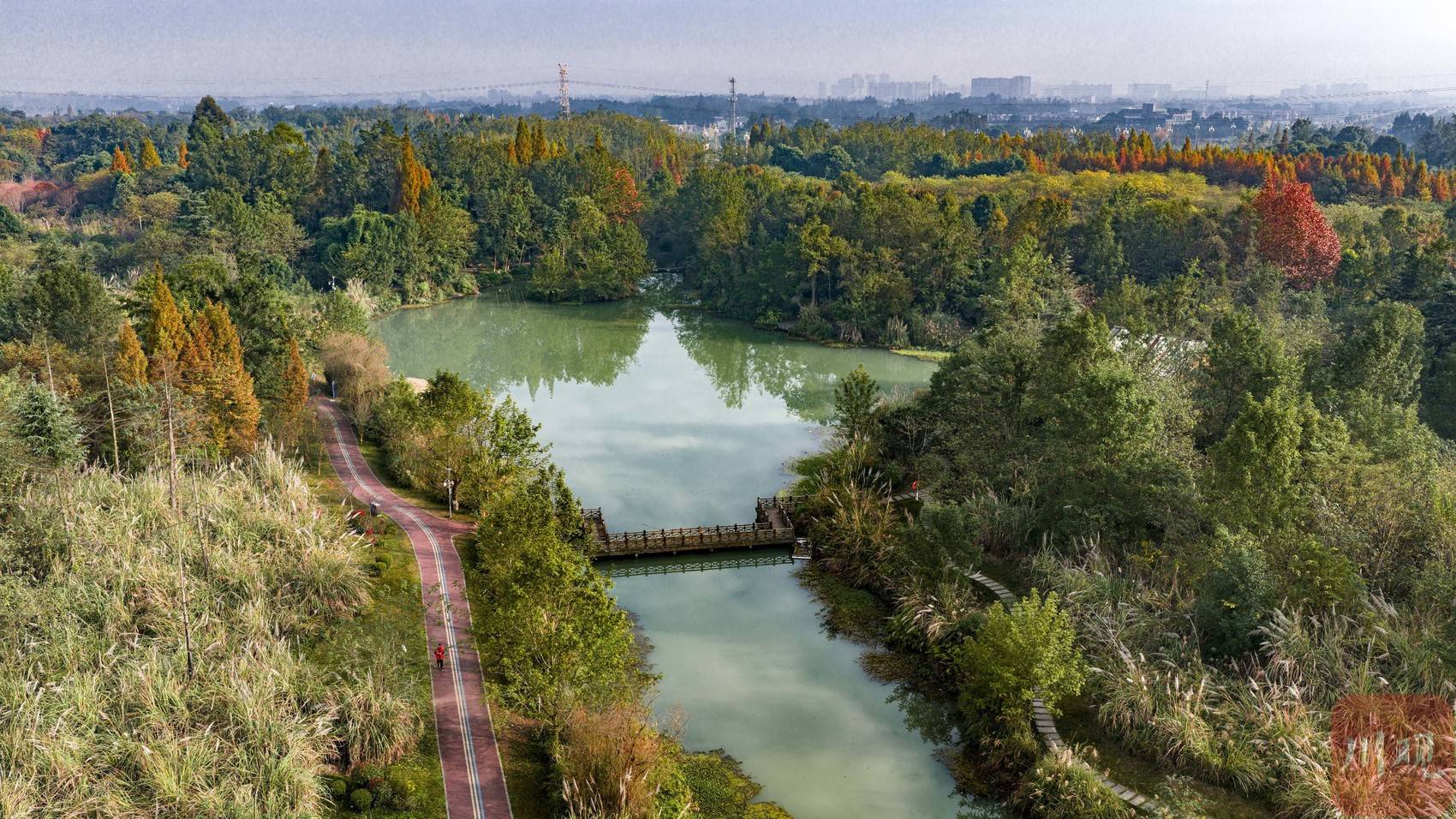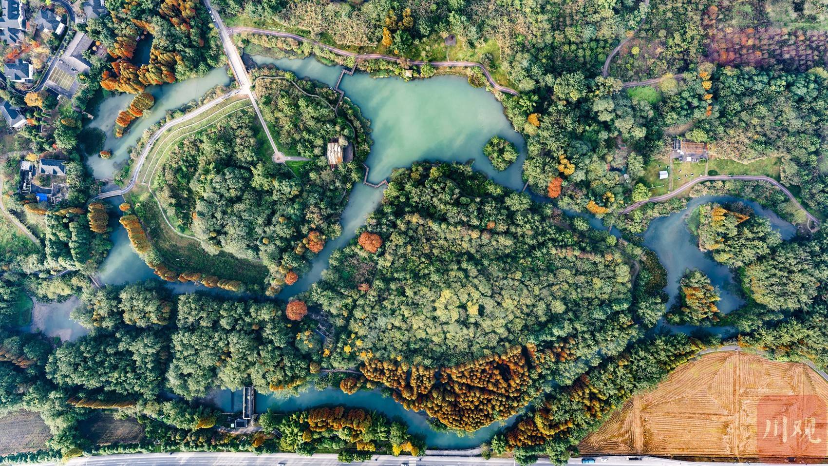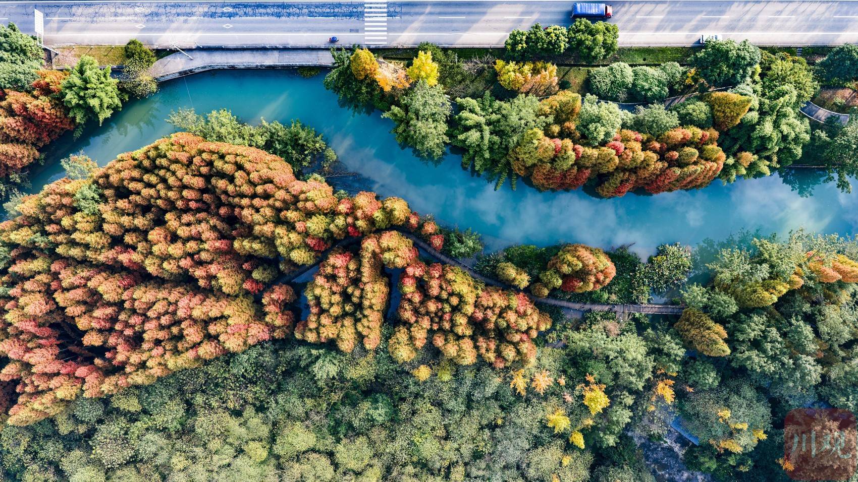 11月23日,崇州市白头镇桤木河湿地公园水杉林金黄、橙红、深红交织,将林子装点得绚烂夺目,呈现出层次丰富的色彩变化。挺拔的树干与火红的叶片倒映在清澈静谧的水面,形成“红杉映碧水”的美景,仿佛大自然亲手调出的滤镜,美轮美奂。