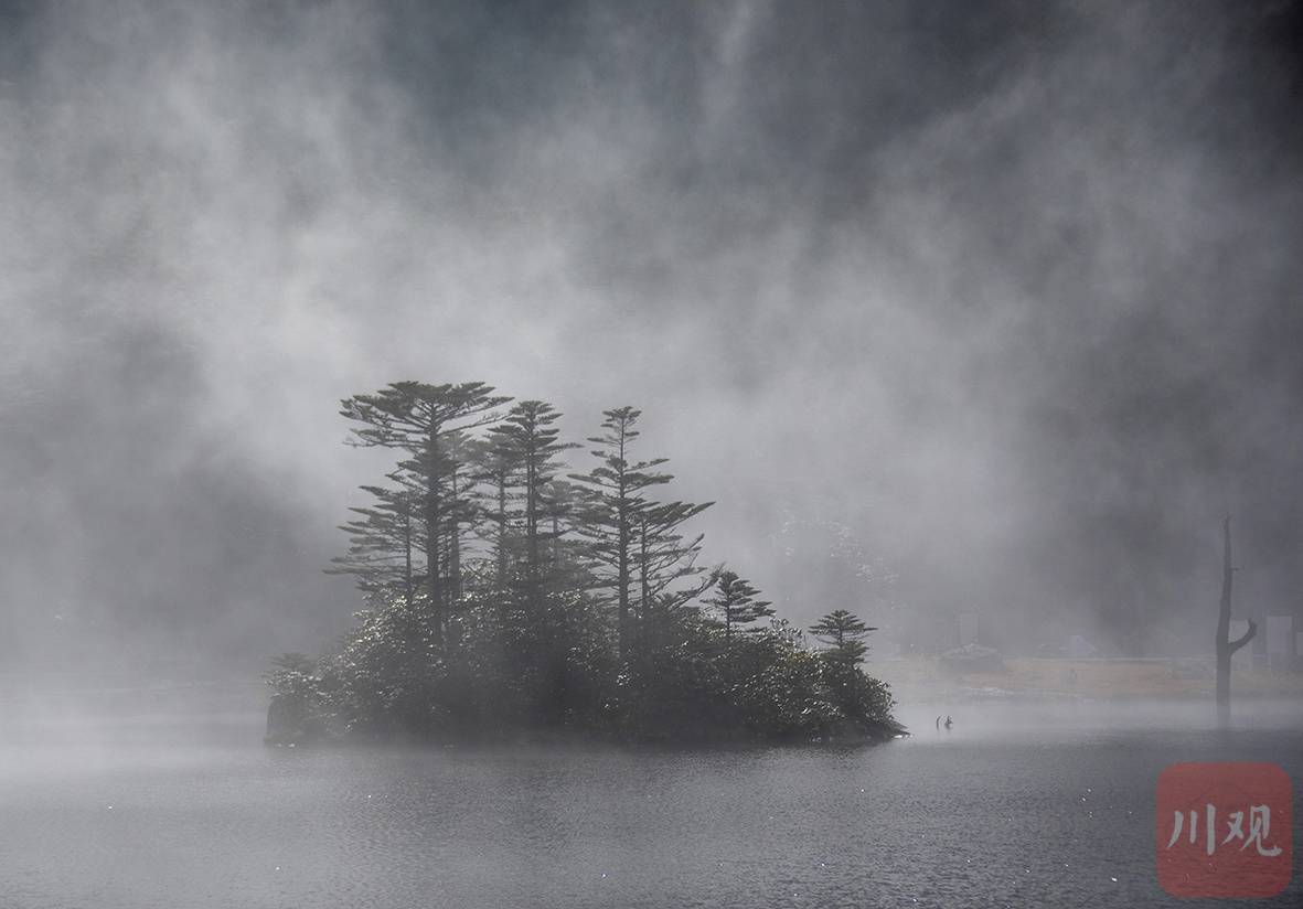 普格螺髻山湖泊云雾缥缈,湖心树岛若隐若现。