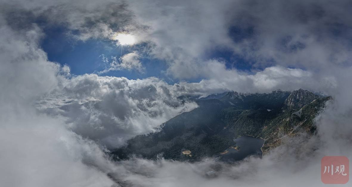 普格螺髻山云海翻涌,湖泊与山峦在云雾中若隐若现。