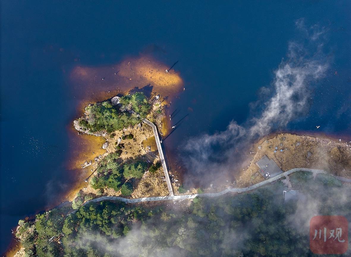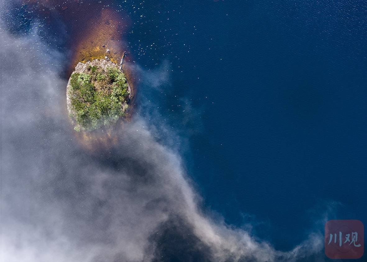 普格螺髻山湖心岛云雾缥缈,镶嵌于深蓝湖水中。