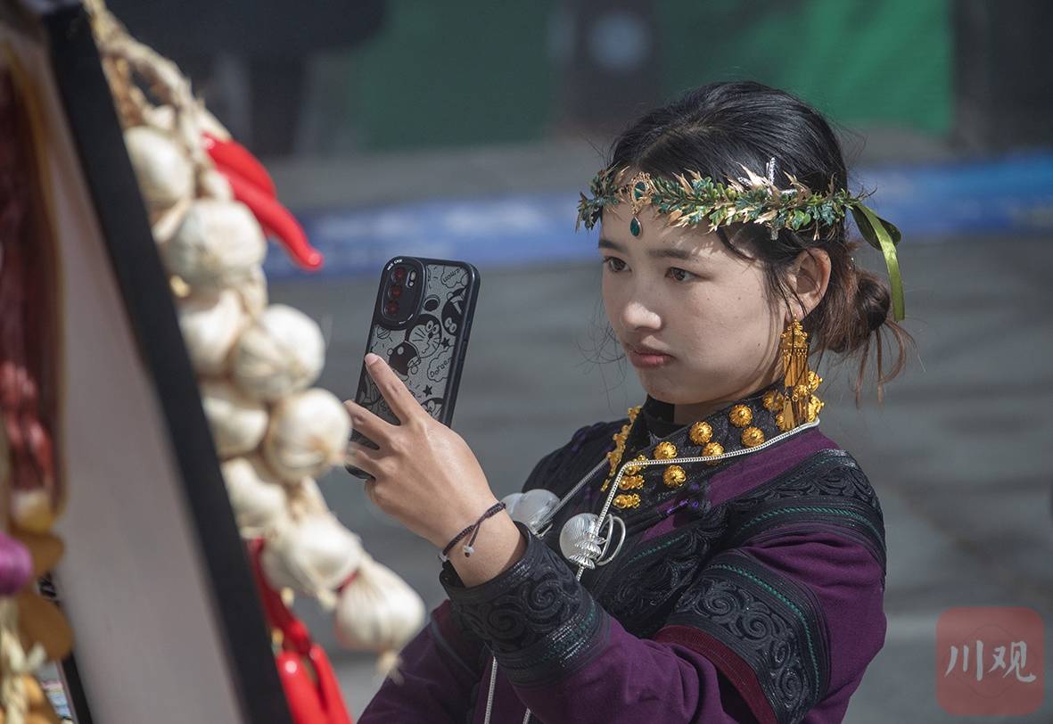 身着传统服饰的彝族姑娘,用手机拍摄民俗挂饰。