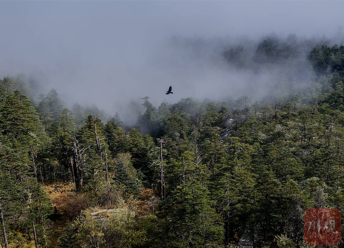 普格螺髻山云雾林海间,飞鸟翱翔,高原森林生态秘境之美跃然眼前。