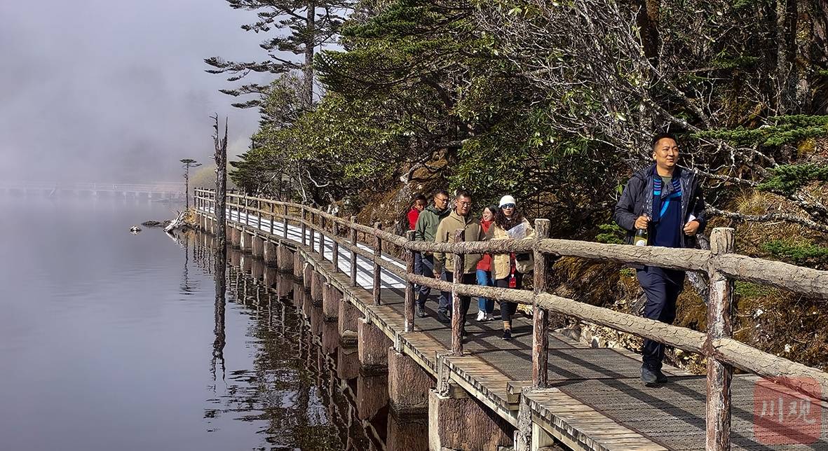 普格螺髻山湖畔栈道,游客漫步于云雾林海间。