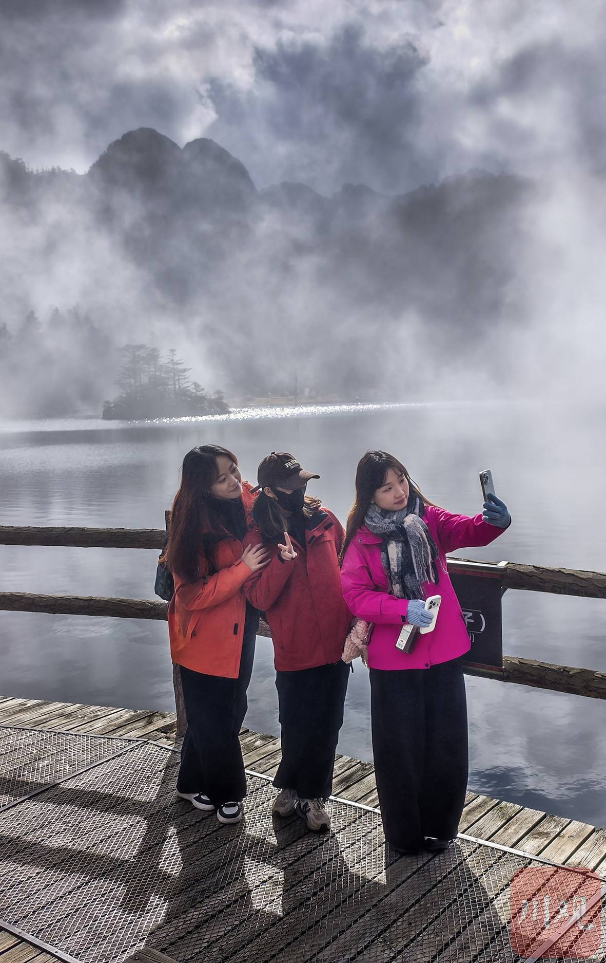 普格螺髻山湖畔,游客在云雾缭绕的仙境中拍照打卡。