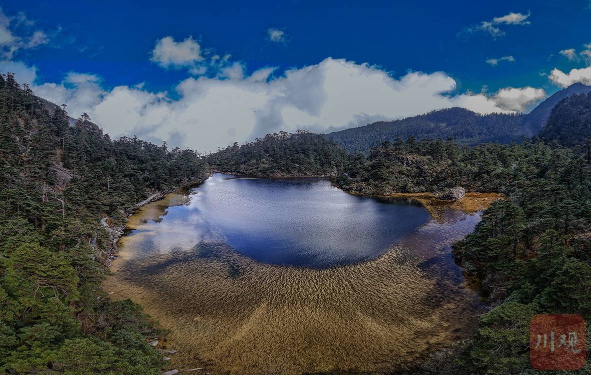 普格螺髻山湖泊嵌于林海,蓝天白云与碧水相映。