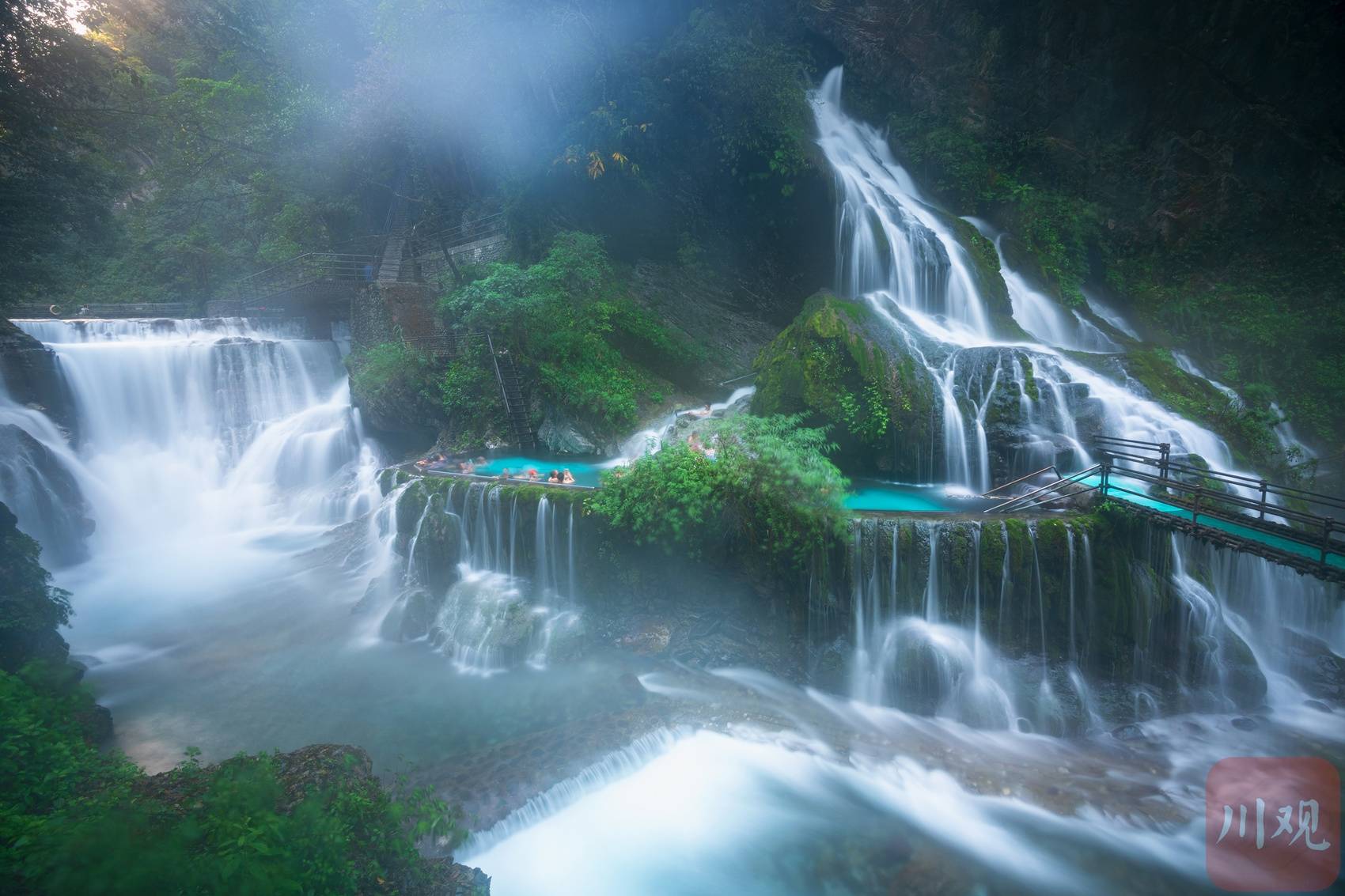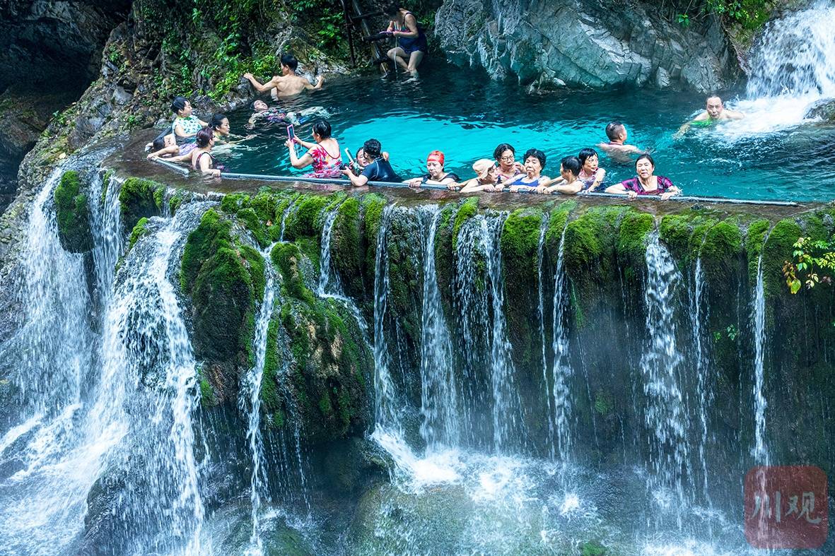 螺髻山九十九里温泉瀑布,游客在瀑布顶端的天然温泉中嬉戏,尽享山水间的惬意时光。