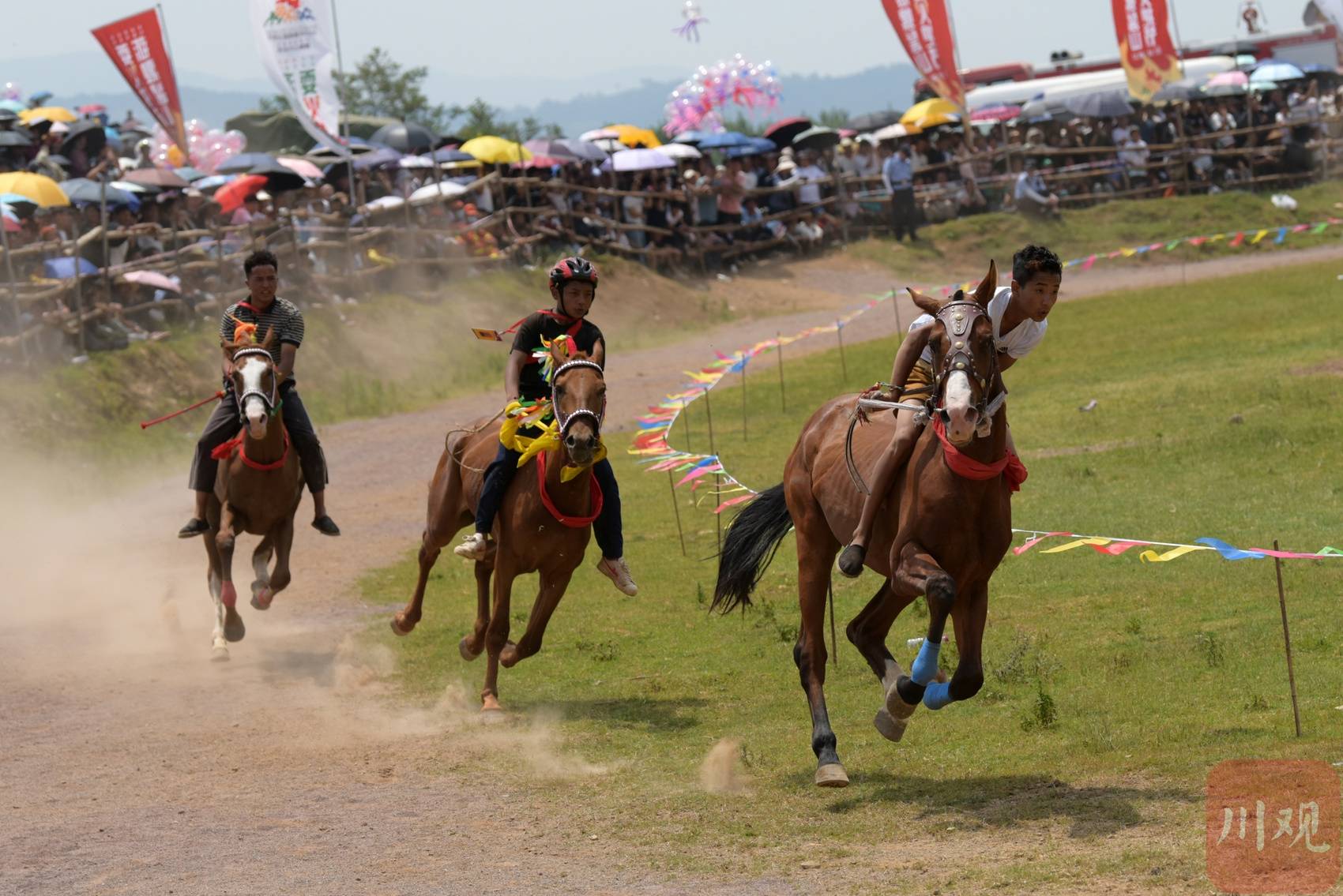 螺髻山凉山彝族赛马活动现场,骑手们策马奔腾。