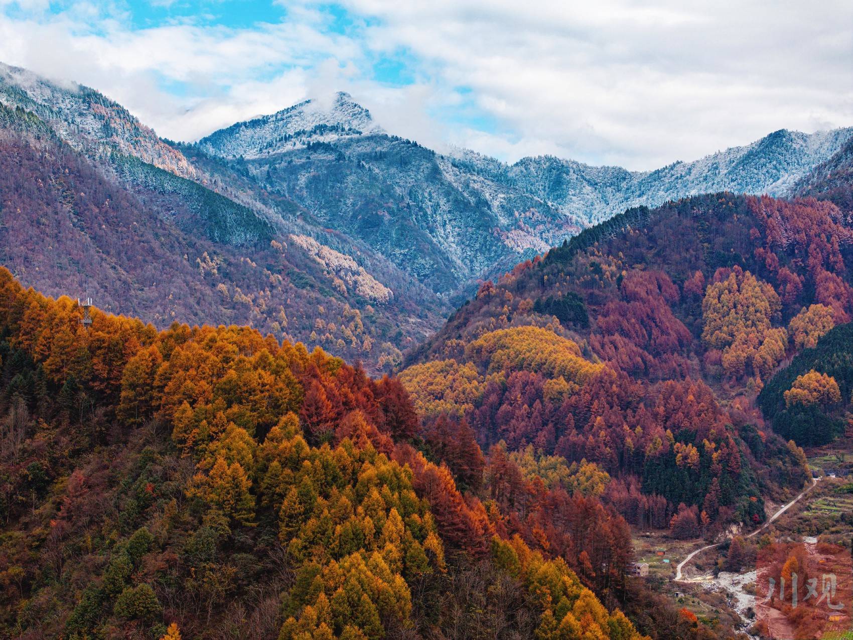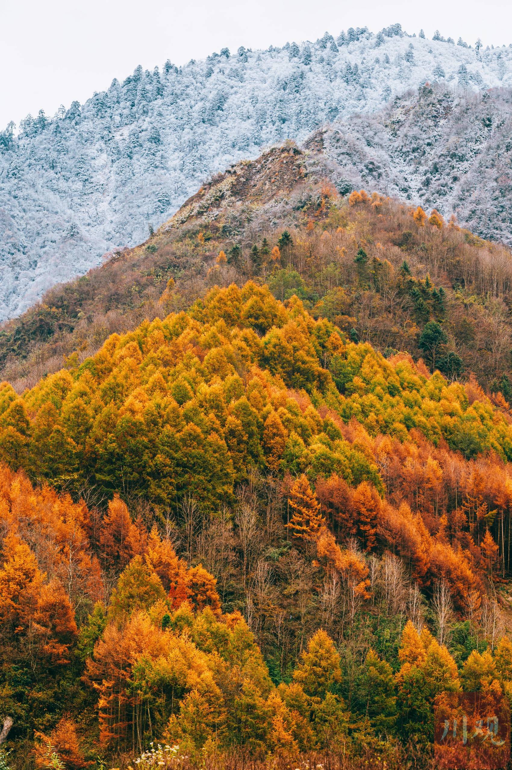 11月底,阿坝州汶川县耿达镇藏着最惊艳的季节碰撞。一场初雪过后,山体被巧妙分割,成就 “半山雪、半山彩” 的景观。