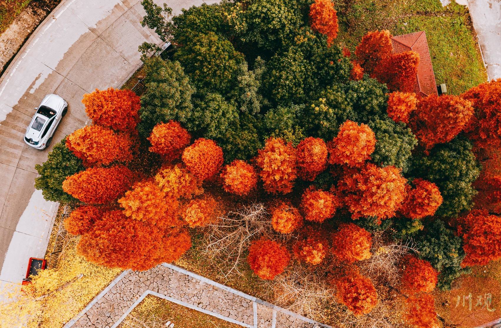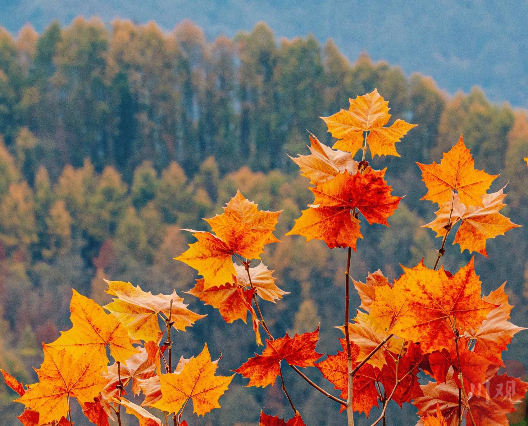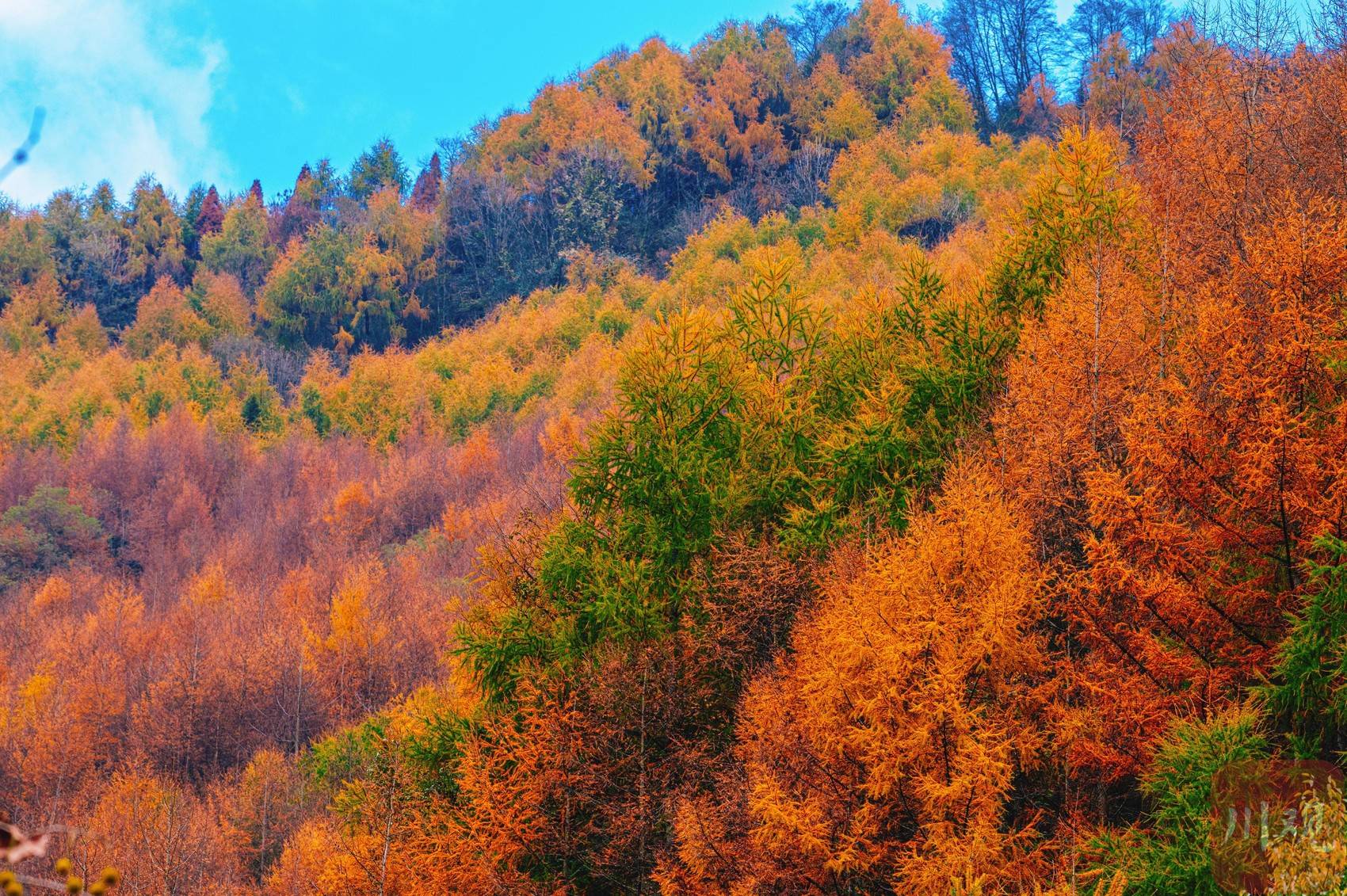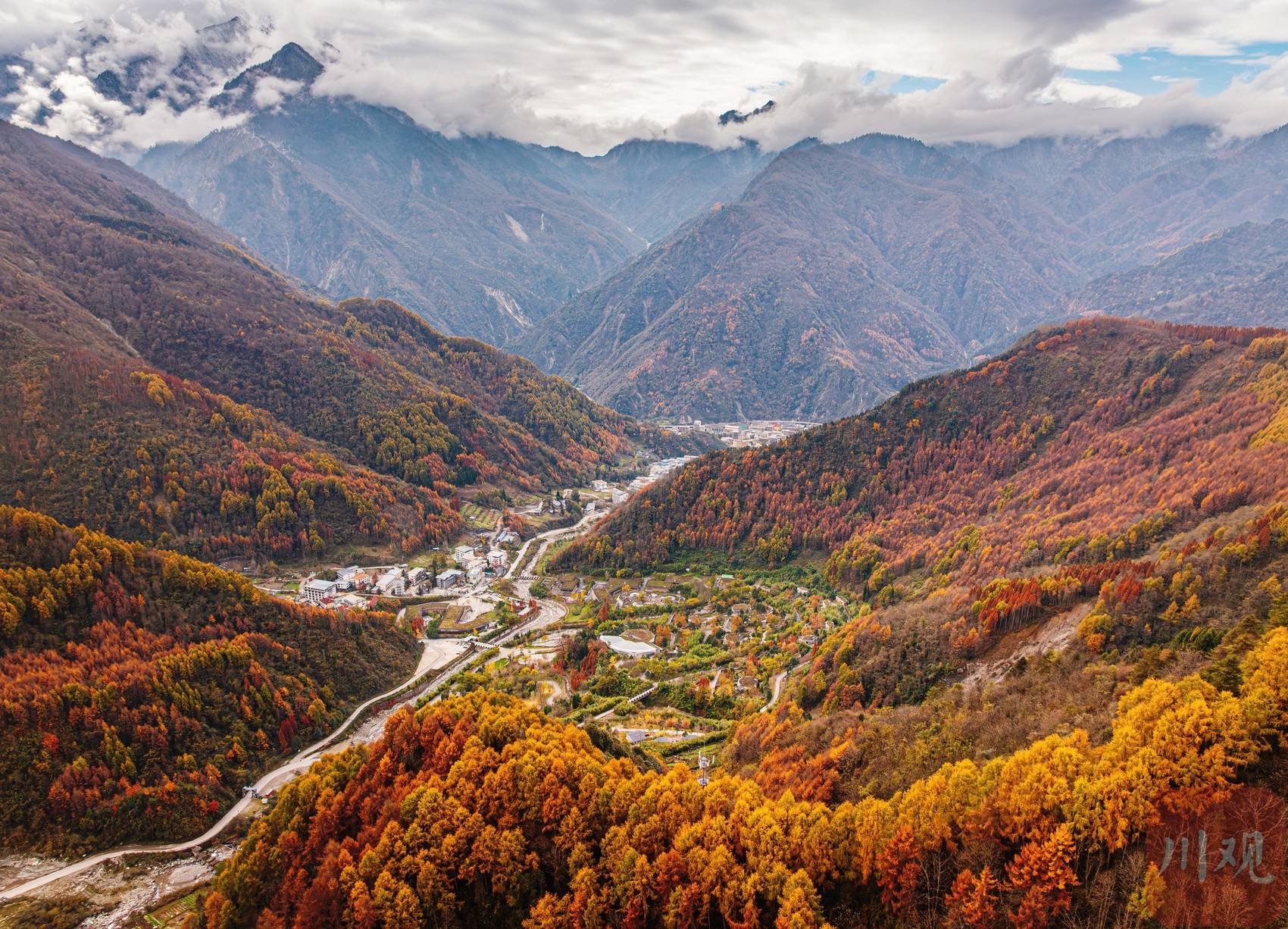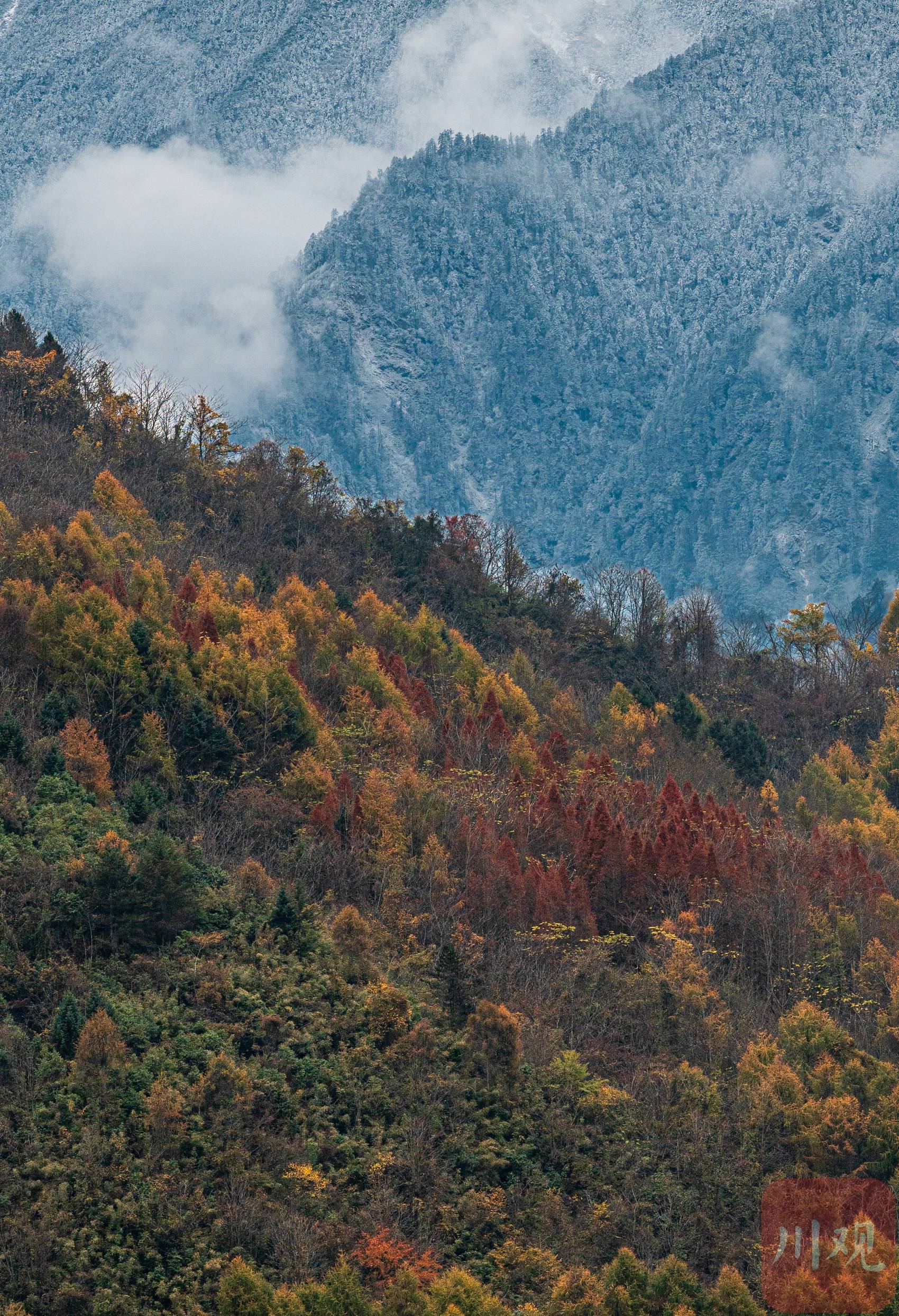 海拔渐升处,白雪轻裹山脊。下半山却是层层彩林铺展至河谷。