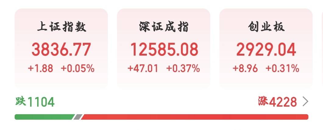 11月24日,A股市场探底回升,三大指数小幅收涨,局部热点板块表现活跃。截至收盘,上证指数报3836.77点,上涨0.05%;深证成指报12585.08点,上涨0.37%;创业板指报2929.04点,上涨0.31%。两市合计成交1.73万亿元,较前一交易日略有缩量,反映出市场整体观望情绪较浓,但局部交易热度未减。