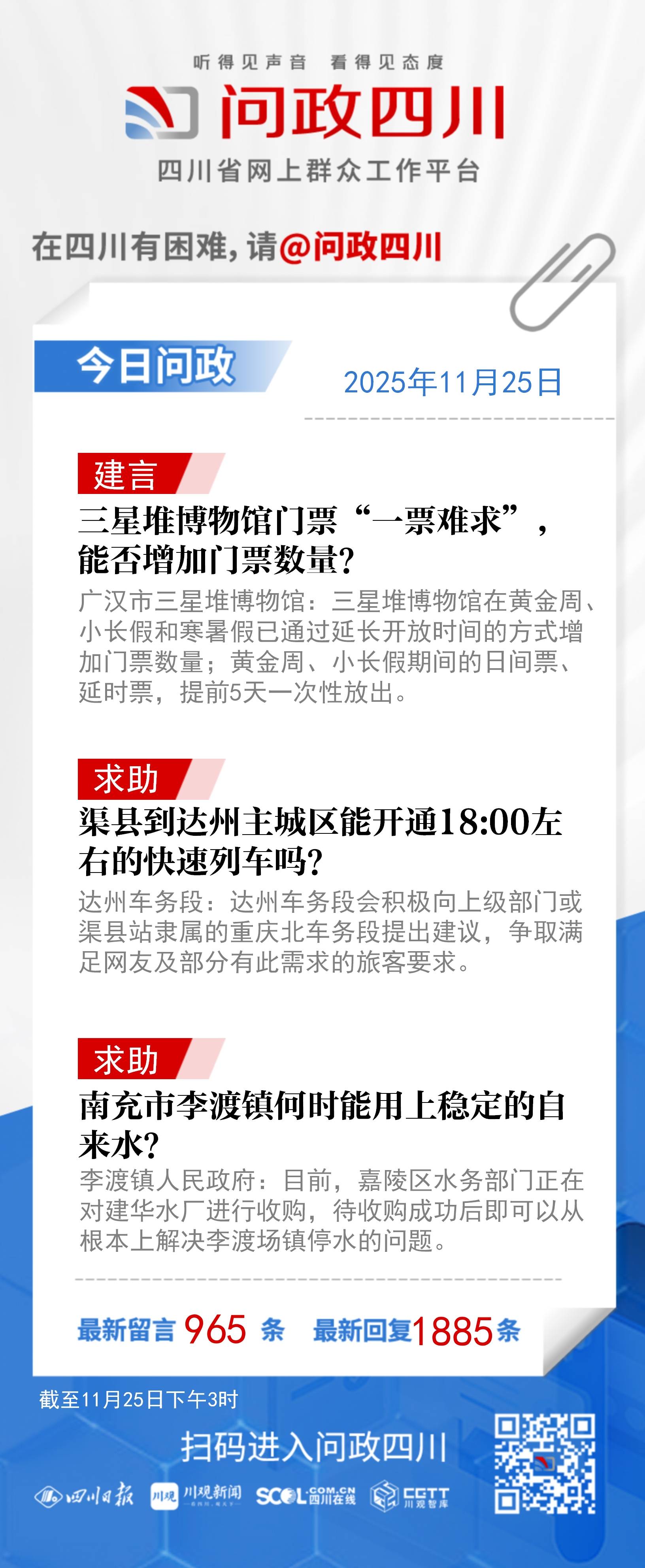问政四川网友提问:我在渠县上班,家住达州主城区,每个周末都要回家。但是渠县到达州的火车班次最晚的一趟是下午两点多,我无法在下班前赶到。为方便像我一样往返两地的群众出行,希望铁路部门能新增18:00前后渠县开往达州的火车班次。