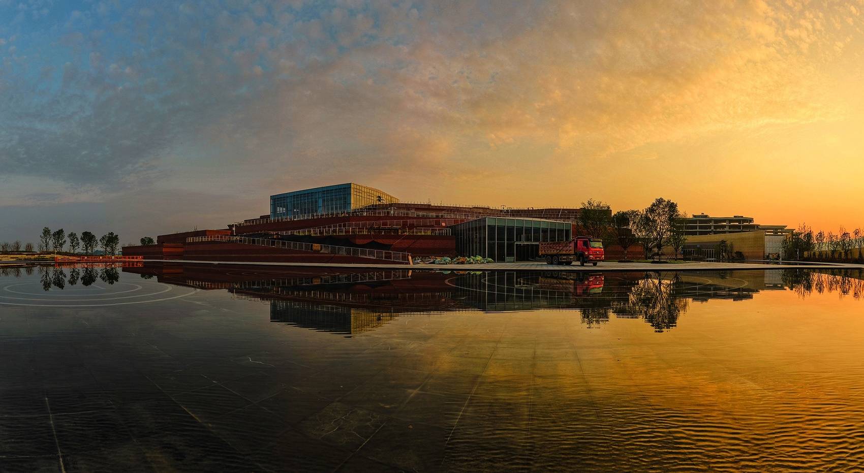 记者探访发现,这座临水而建的砖红色建筑已然成型。目前,博物馆主体工程、外立面装饰及幕墙工程、内部装修、专业库房、总坪景观、考古工作站和游客中心主体等已全面完工。整体建筑静卧水畔、倒映其中,艺术化地隐喻了“沉银出水”的历史瞬间。外墙呈现出层层叠叠的“地质分层”效果,仿佛被徐徐揭开的考古断面,古朴厚重之中透出深远的时空意蕴。