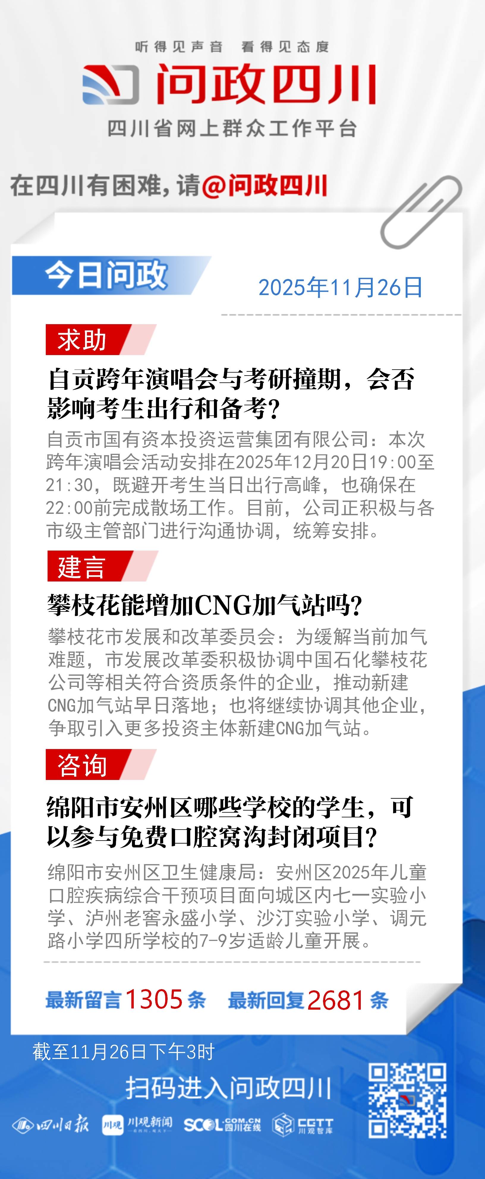 问政四川网友提问:自贡市预计于2025年12月20日晚上在南湖体育中心举办跨年演唱会,但全国研究生考试时间为2025年12月20日至12月21日,演唱会当日全市交通拥堵情况可能对考生20日市区内往返造成不便;另外,演唱会音量也会影响20日晚周围楼栋考生的复习和休息,请相关部门慎重协调活动方案,保证学生安心备考。