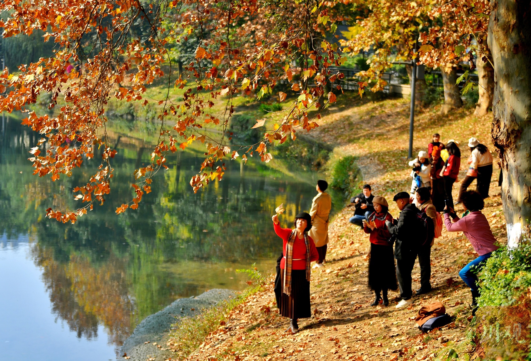 市民在高笋塘社区沙河两岸的梧桐树下拍照。