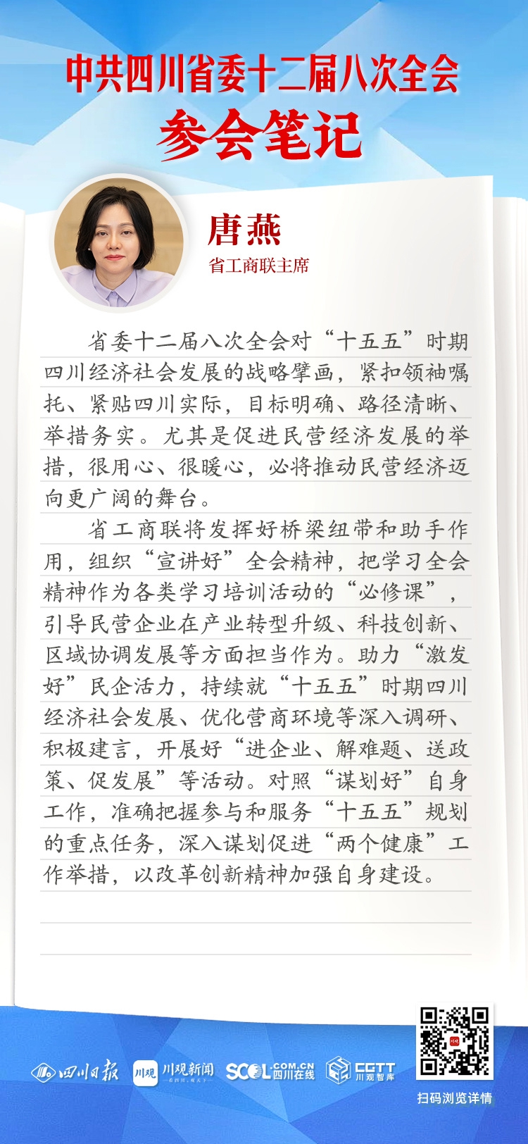 省委十二届八次全会对“十五五”时期四川经济社会发展的战略擘画,紧扣领袖嘱托、紧贴四川实际,目标明确、路径清晰、举措务实。尤其是促进民营经济发展的举措,很用心、很暖心,必将推动民营经济迈向更广阔的舞台。