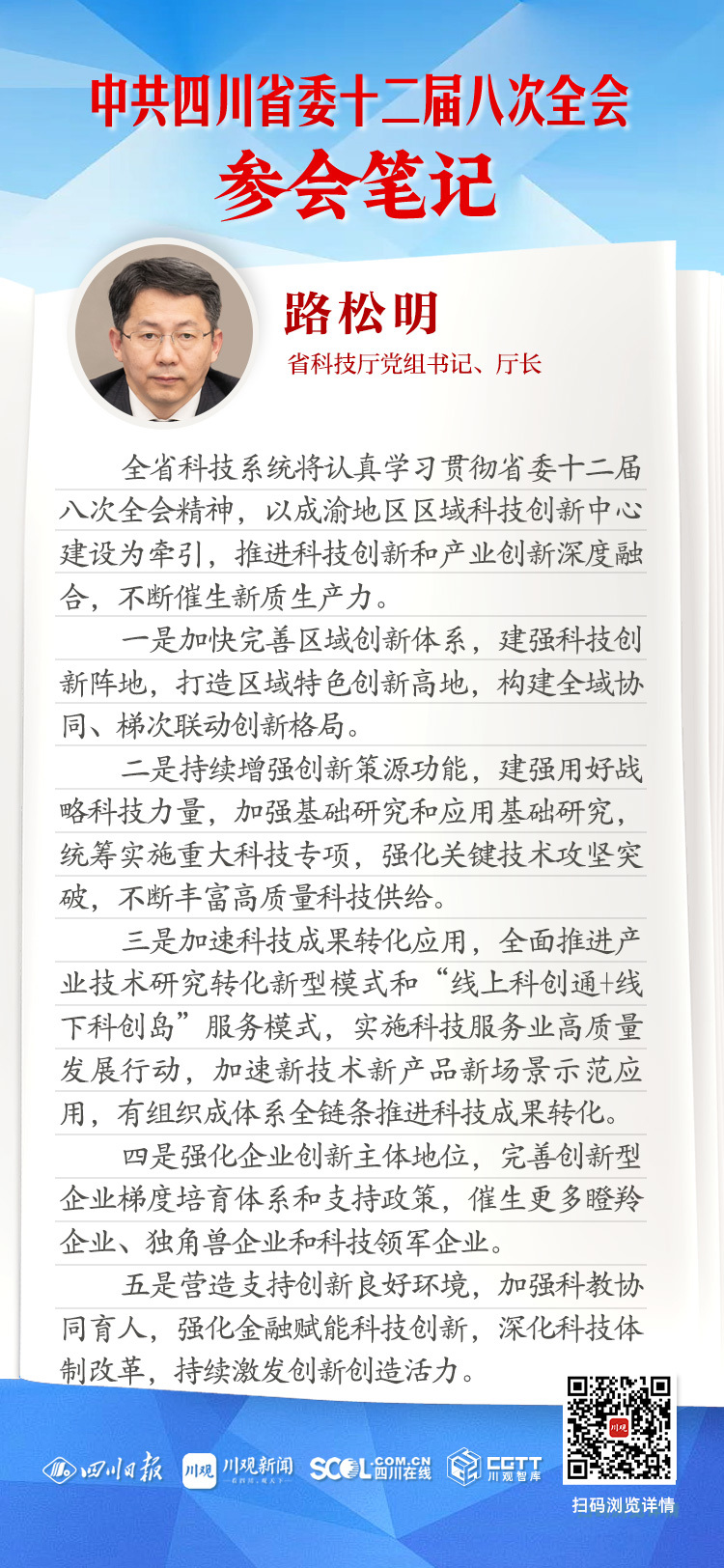 全省科技系统将认真学习贯彻省委十二届八次全会精神,以成渝地区区域科技创新中心建设为牵引,推进科技创新和产业创新深度融合,不断催生新质生产力。