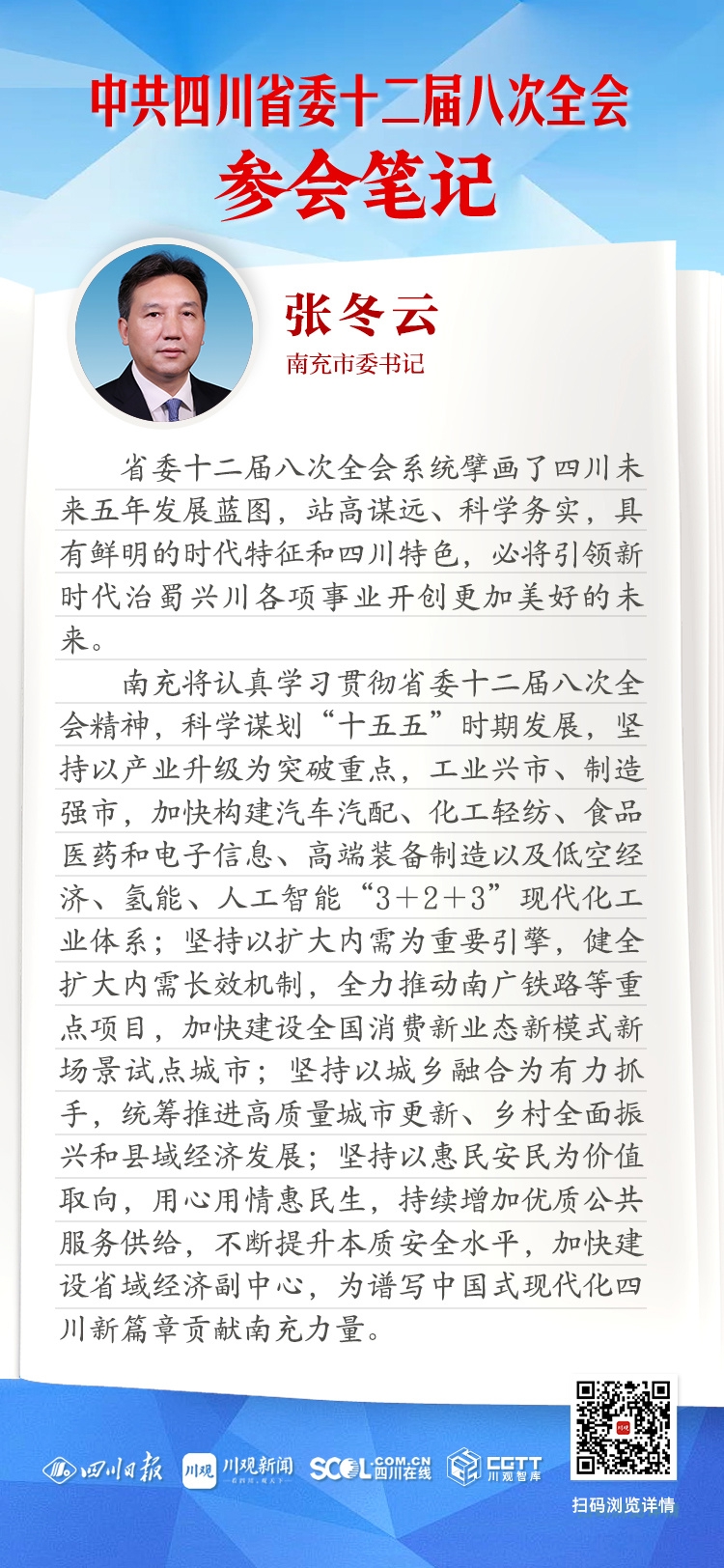 南充将认真学习贯彻省委十二届八次全会精神,科学谋划“十五五”时期发展,坚持以产业升级为突破重点,工业兴市、制造强市,加快构建汽车汽配、化工轻纺、食品医药和电子信息、高端装备制造以及低空经济、氢能、人工智能“3+2+3”现代化工业体系;坚持以扩大内需为重要引擎,健全扩大内需长效机制,全力推动南广铁路等重点项目,加快建设全国消费新业态新模式新场景试点城市;坚持以城乡融合为有力抓手,统筹推进高质量城市更新、乡村全面振兴和县域经济发展;坚持以惠民安民为价值取向,用心用情惠民生,持续增加优质公共服务供给,不断提升本质安全水平,加快建设省域经济副中心,为谱写中国式现代化四川新篇章贡献南充力量。