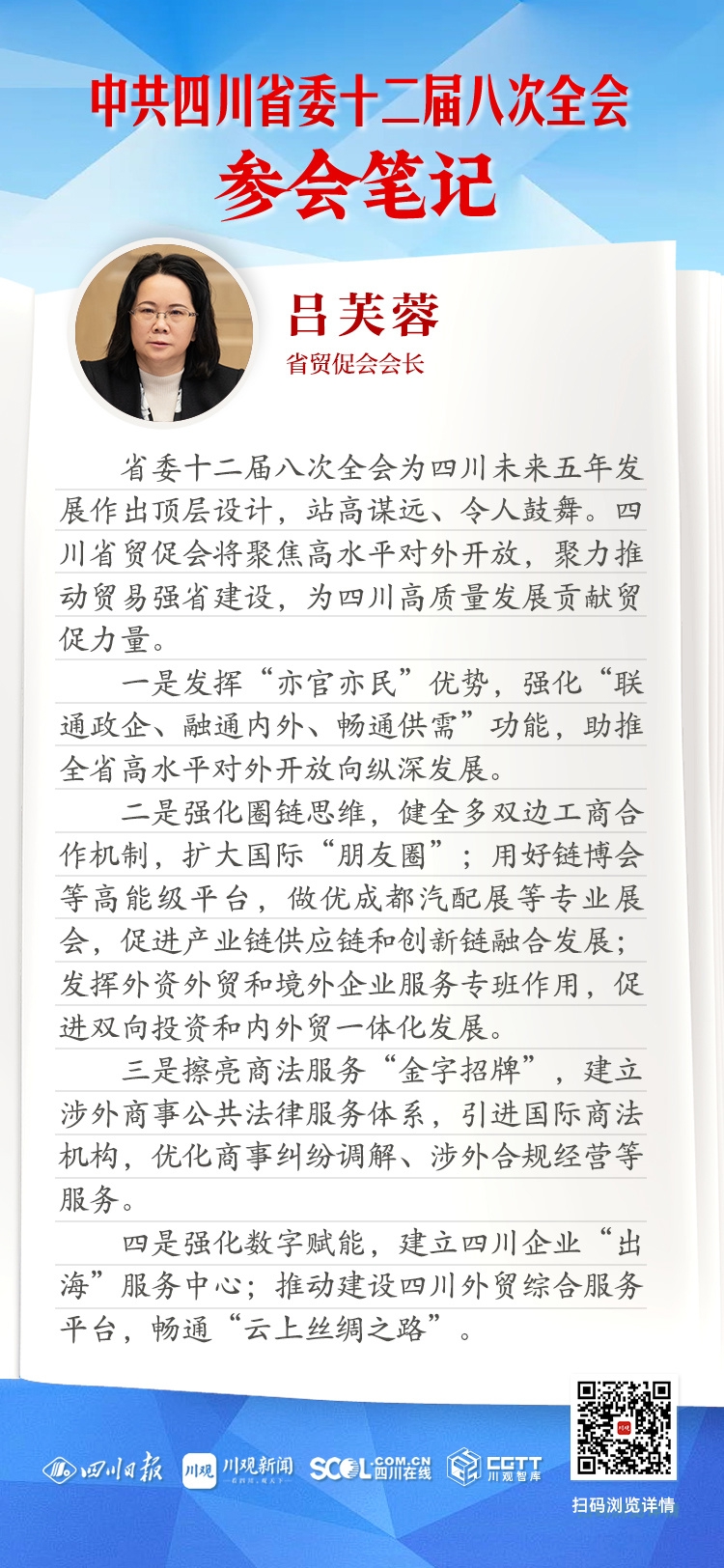 省委十二届八次全会为四川未来五年发展作出顶层设计,站高谋远、令人鼓舞。四川省贸促会将聚焦高水平对外开放,聚力推动贸易强省建设,为四川高质量发展贡献贸促力量。
