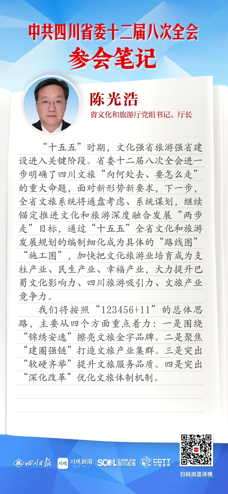 “十五五”时期,文化强省旅游强省建设进入关键阶段。省委十二届八次全会进一步明确了四川文旅“向何处去、要怎么走”的重大命题,面对新形势新要求,下一步,全省文旅系统将通盘考虑、系统谋划,继续锚定推进文化和旅游深度融合发展“两步走”目标,通过“十五五”全省文化和旅游发展规划的编制细化成为具体的“路线图”“施工图”,加快把文化旅游业培育成为支柱产业、民生产业、幸福产业,大力提升巴蜀文化影响力、四川旅游吸引力、文旅产业竞争力。