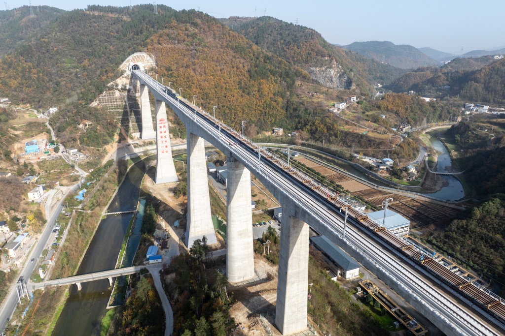 11月27日,在湖北十堰神定河特大桥上,西安至十堰高速铁路(简称“西十高铁”)全线最后一对长钢轨铺设落地,标志着西十高铁全线铺轨工程顺利完工,为后续联调联试奠定基础。