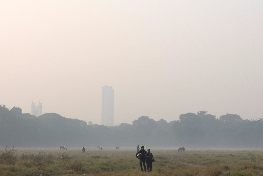 11月27日,在印度加尔各答一处公园,人们站在雾霾中。