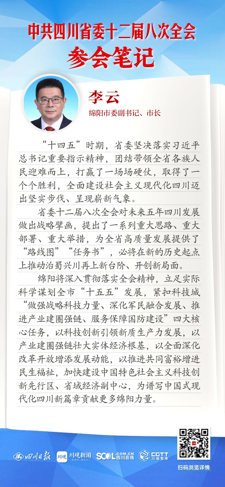 绵阳将深入贯彻落实全会精神,立足实际科学谋划全市“十五五”发展,紧扣科技城“做强战略科技力量、深化军民融合发展、推进产业建圈强链、服务保障国防建设”四大核心任务,以科技创新引领新质生产力发展,以产业建圈强链壮大实体经济根基,以全面深化改革开放增添发展动能,以推进共同富裕增进民生福祉,加快建设中国特色社会主义科技创新先行区、省域经济副中心,为谱写中国式现代化四川新篇章贡献更多绵阳力量。