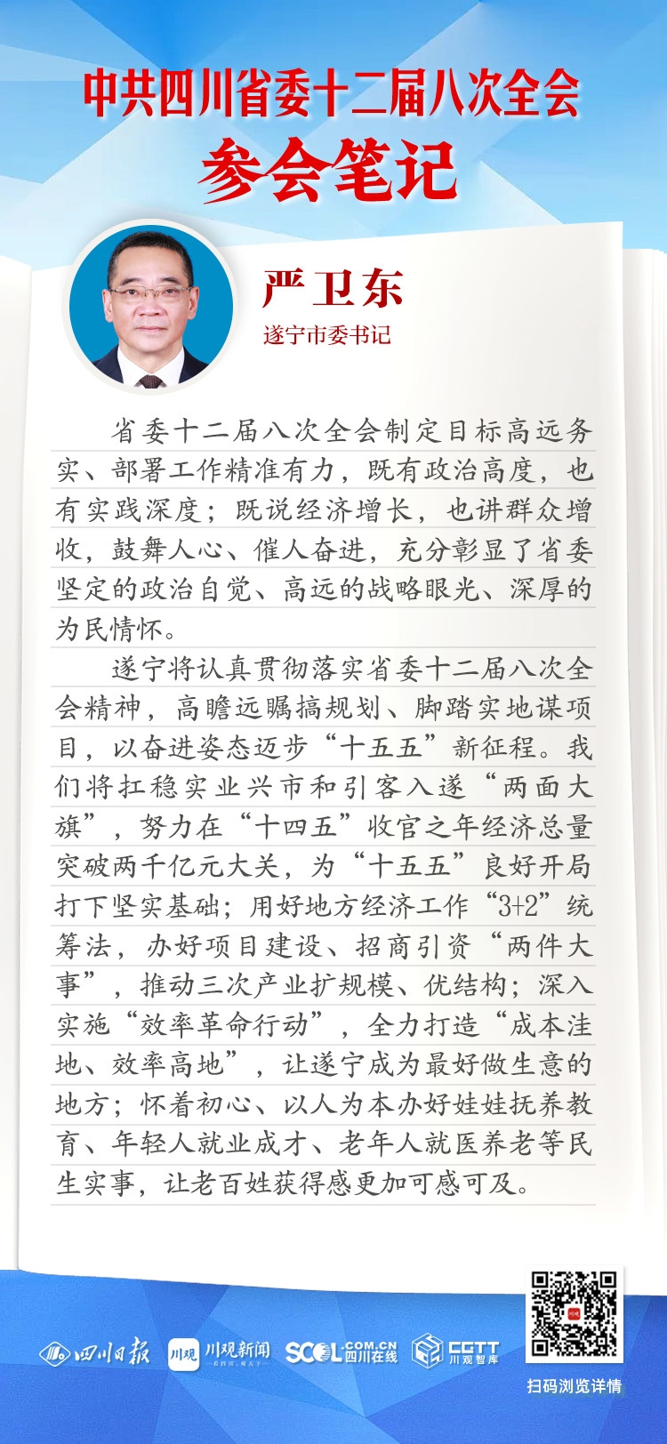 遂宁将认真贯彻落实省委十二届八次全会精神,高瞻远瞩搞规划、脚踏实地谋项目,以奋进姿态迈步“十五五”新征程。我们将扛稳实业兴市和引客入遂“两面大旗”,努力在“十四五”收官之年经济总量突破两千亿元大关,为“十五五”良好开局打下坚实基础;用好地方经济工作“3+2”统筹法,办好项目建设、招商引资“两件大事”,推动三次产业扩规模、优结构;深入实施“效率革命行动”,全力打造“成本洼地、效率高地”,让遂宁成为最好做生意的地方;怀着初心、以人为本办好娃娃抚养教育、年轻人就业成才、老年人就医养老等民生实事,让老百姓获得感更加可感可及。