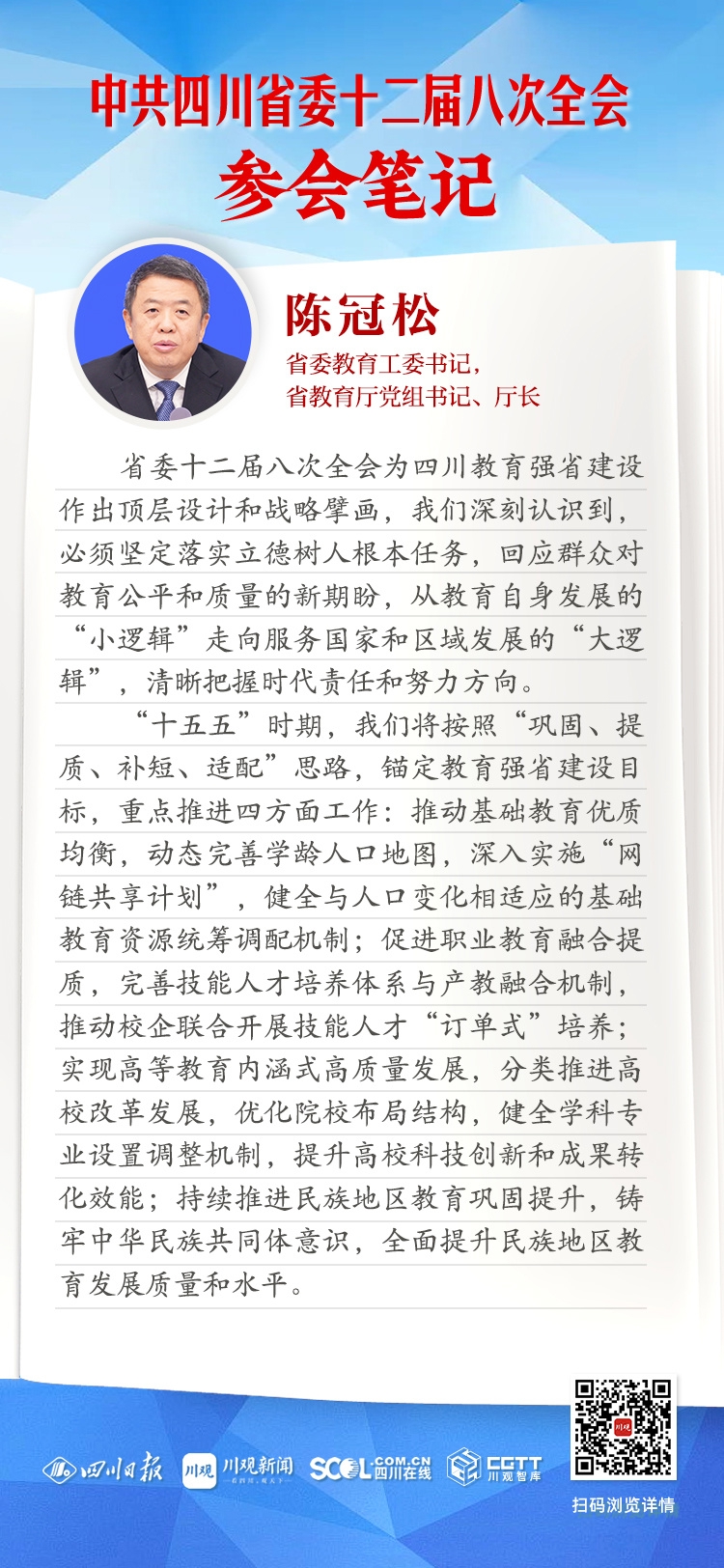 省委十二届八次全会为四川教育强省建设作出顶层设计和战略擘画,我们深刻认识到,必须坚定落实立德树人根本任务,回应群众对教育公平和质量的新期盼,从教育自身发展的“小逻辑”走向服务国家和区域发展的“大逻辑”,清晰把握时代责任和努力方向。