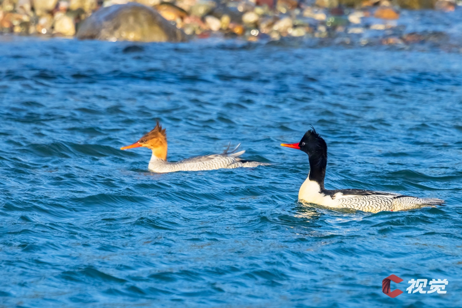 11月27日 ,初冬时节,中华秋沙鸭如约迁徙至都江堰外江河段越冬,这一珍稀鸟类已连续5年飞抵岷江流域该河段。它们时而水中嬉戏,时而觅食鱼虾,成为一道美丽的风景线。