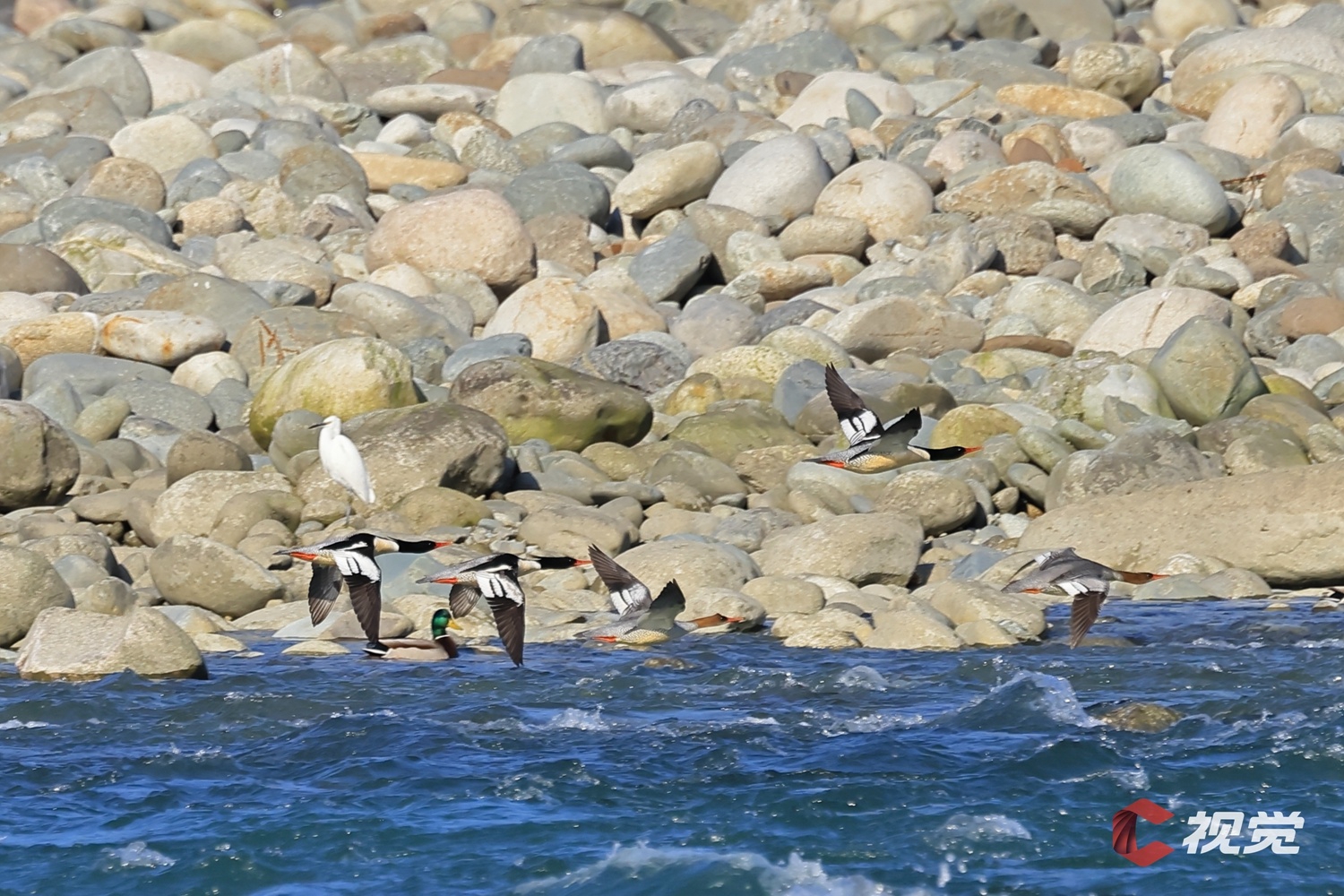 飞抵都江堰外江河段越冬的中华秋沙鸭