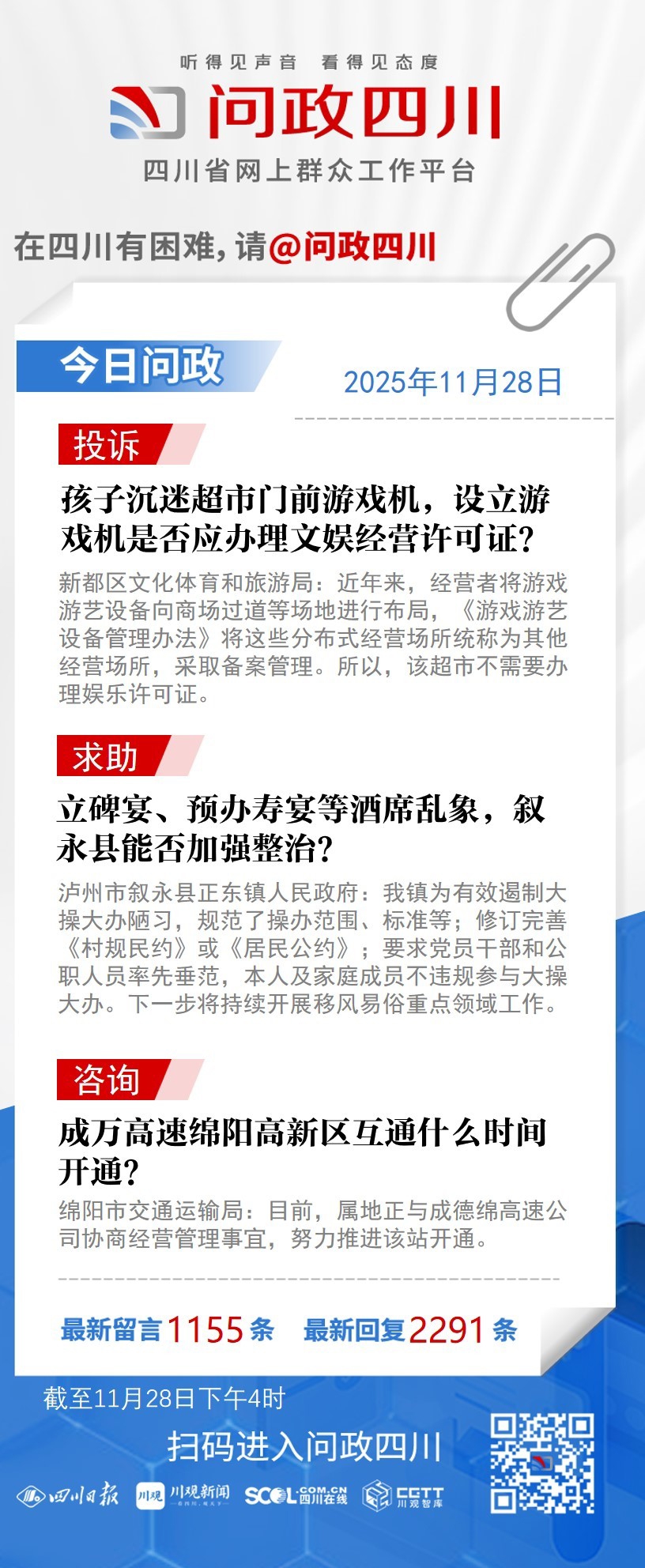 在四川有困难,找问政四川。如果您在四川遇到了操心事、烦心事、揪心事,请登录“四川省网上群众工作平台——问政四川”或拨打问政四川热线(028-96001)留言反映、求助或建议。我们将充分发挥平台的互动联系作用及舆论监督功能,第一时间传递民声,推动问题得以及时解决——听得见声音,看得见态度。