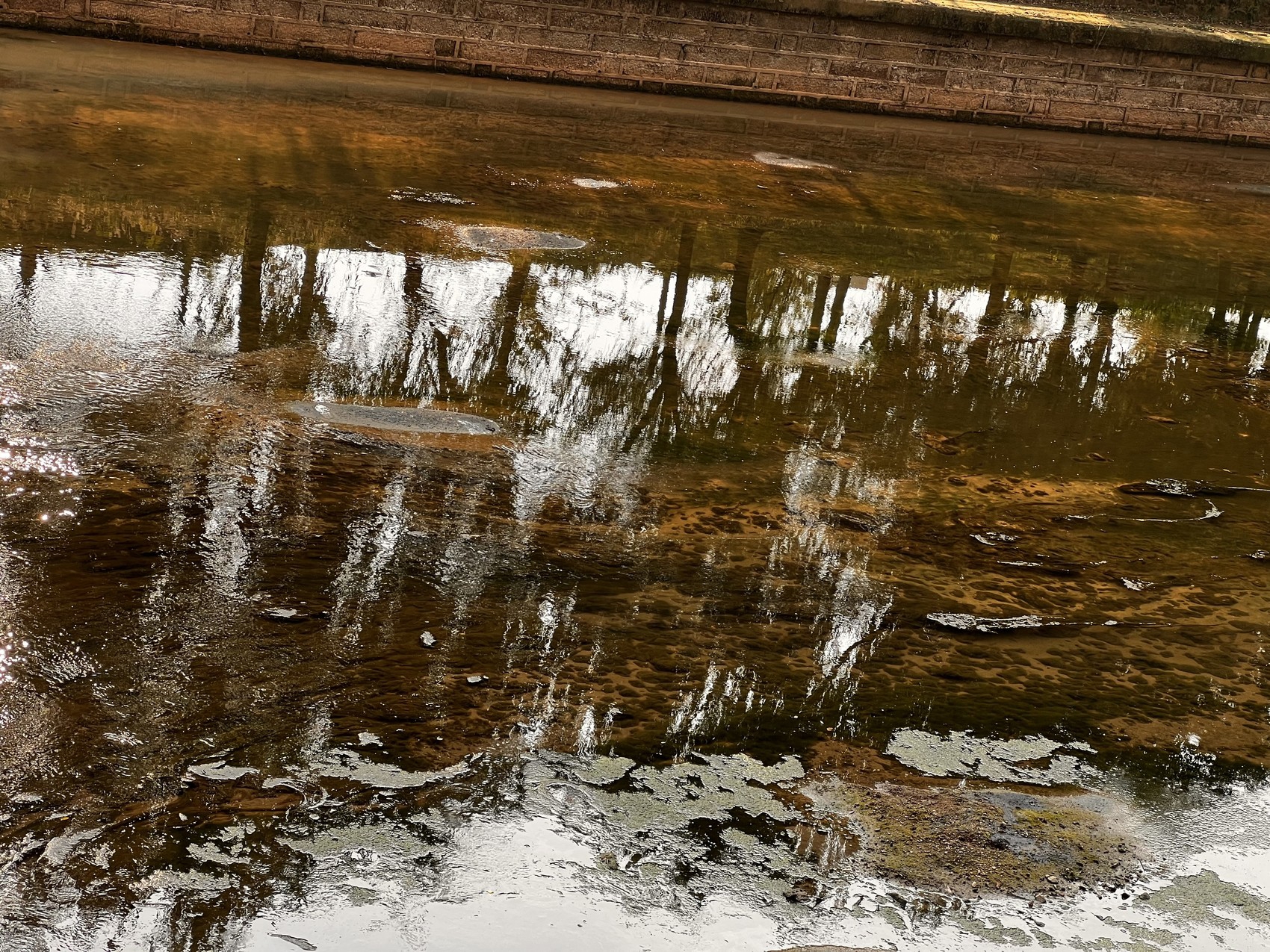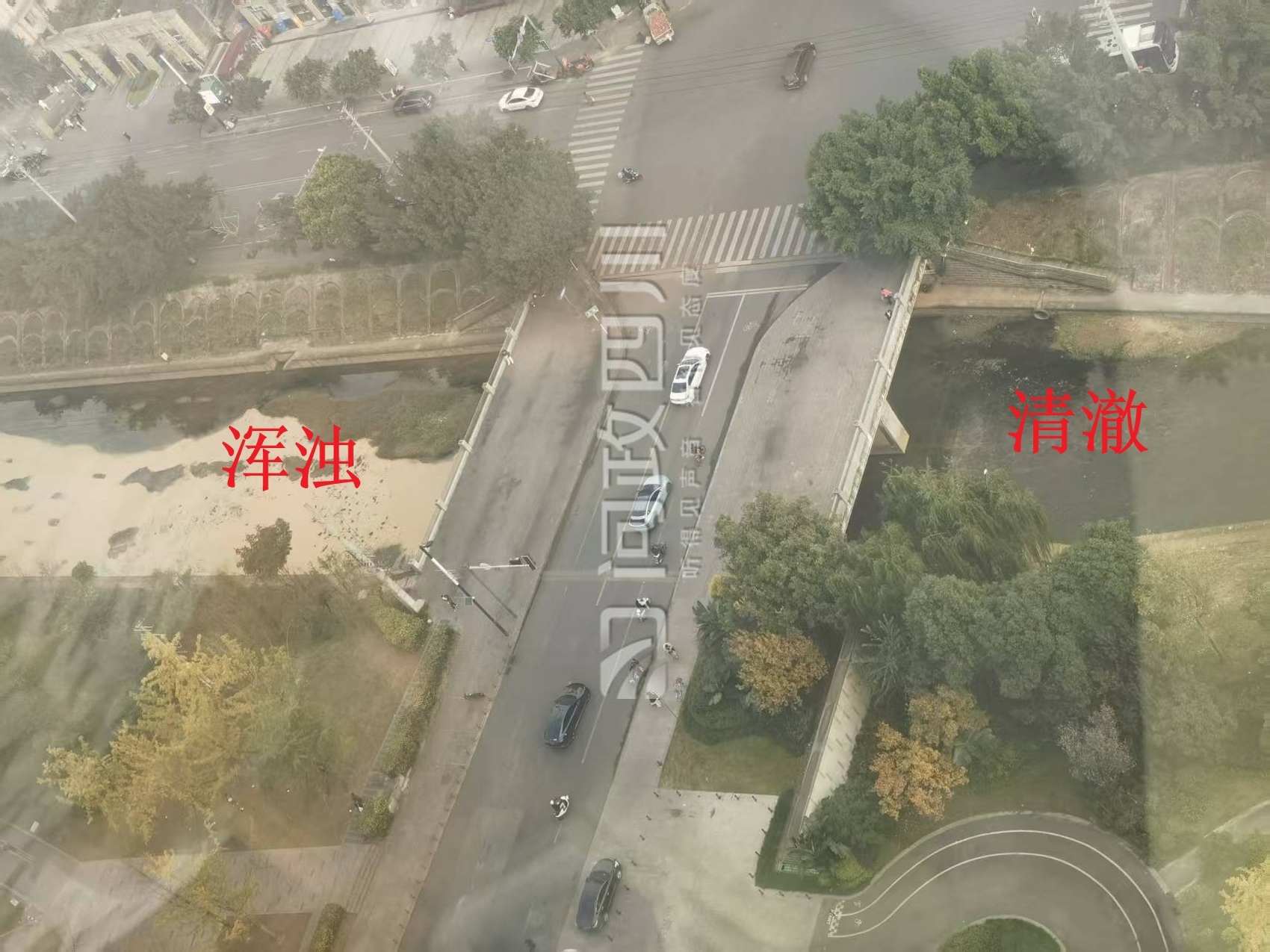 一桥之隔,上游水清澈见水草,下游水浑浊泛黄