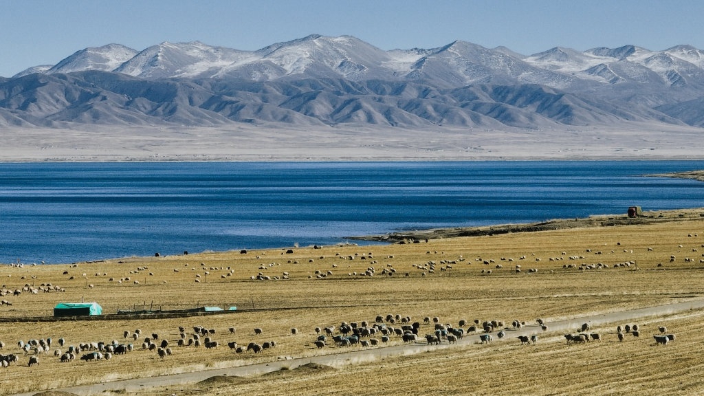 冬日,在青海省海南藏族自治州共和县江西沟镇附近的青海湖湖畔,牧民赶着羊群在这里放牧,湛蓝的湖水与羊群相映成景,绘就一幅冬日牧羊图。