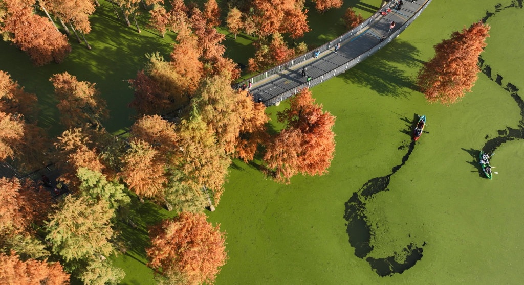 随着气温降低,浙江省杭州市青山湖的近百亩池杉、落羽杉披上色彩斑斓的“衣装”,和水面碧绿的浮萍相映成景。