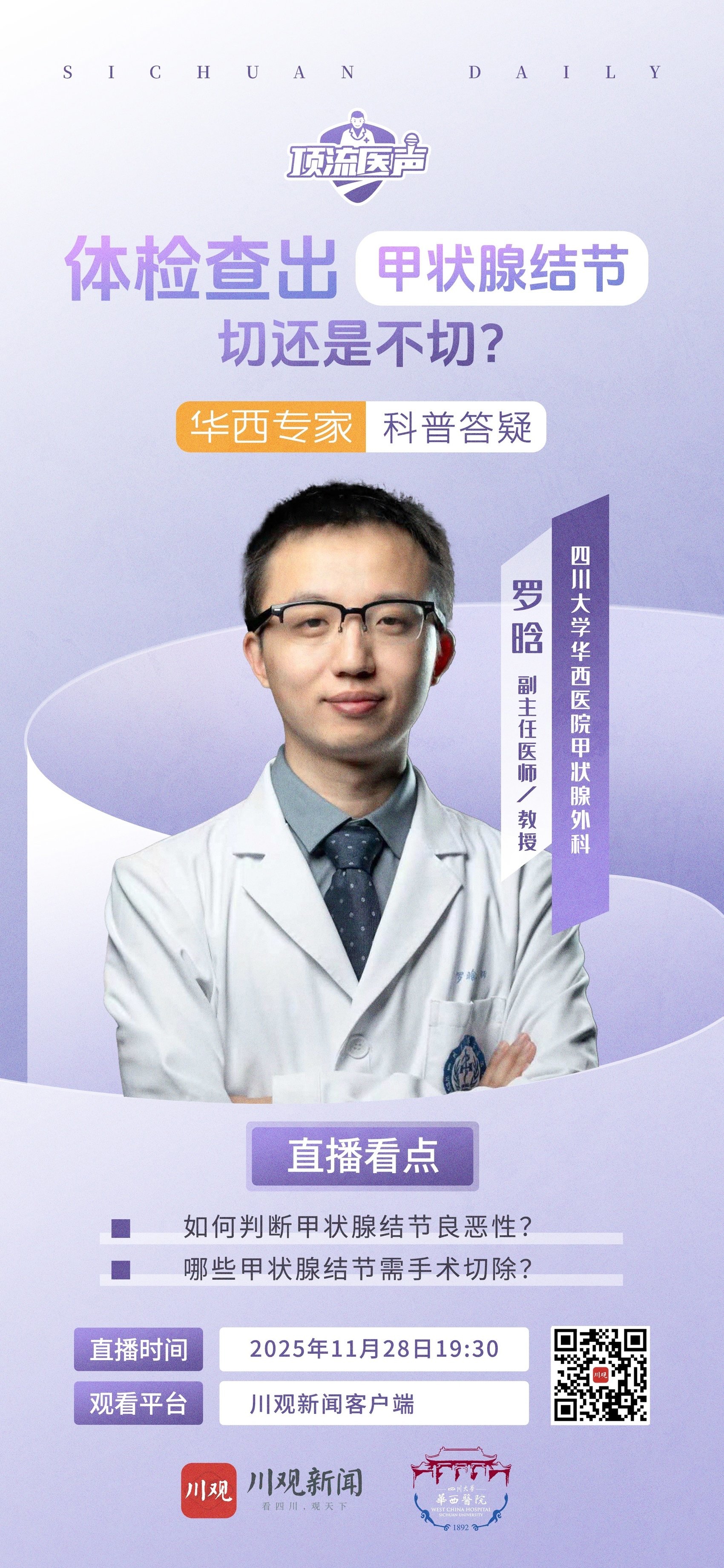 体检中甲状腺检查已成必选项,而甲状腺结节、甲功异常、甲亢甲减等问题,常让人们对着体检报告犯愁。近日,川观新闻特邀四川大学华西医院甲状腺外科副主任医师罗晗教授开展“顶流医声”直播,围绕甲状腺结节诊疗、甲状腺疾病防治等热点问题进行科普答疑,为公众梳理出一份实用的甲状腺科普要点。