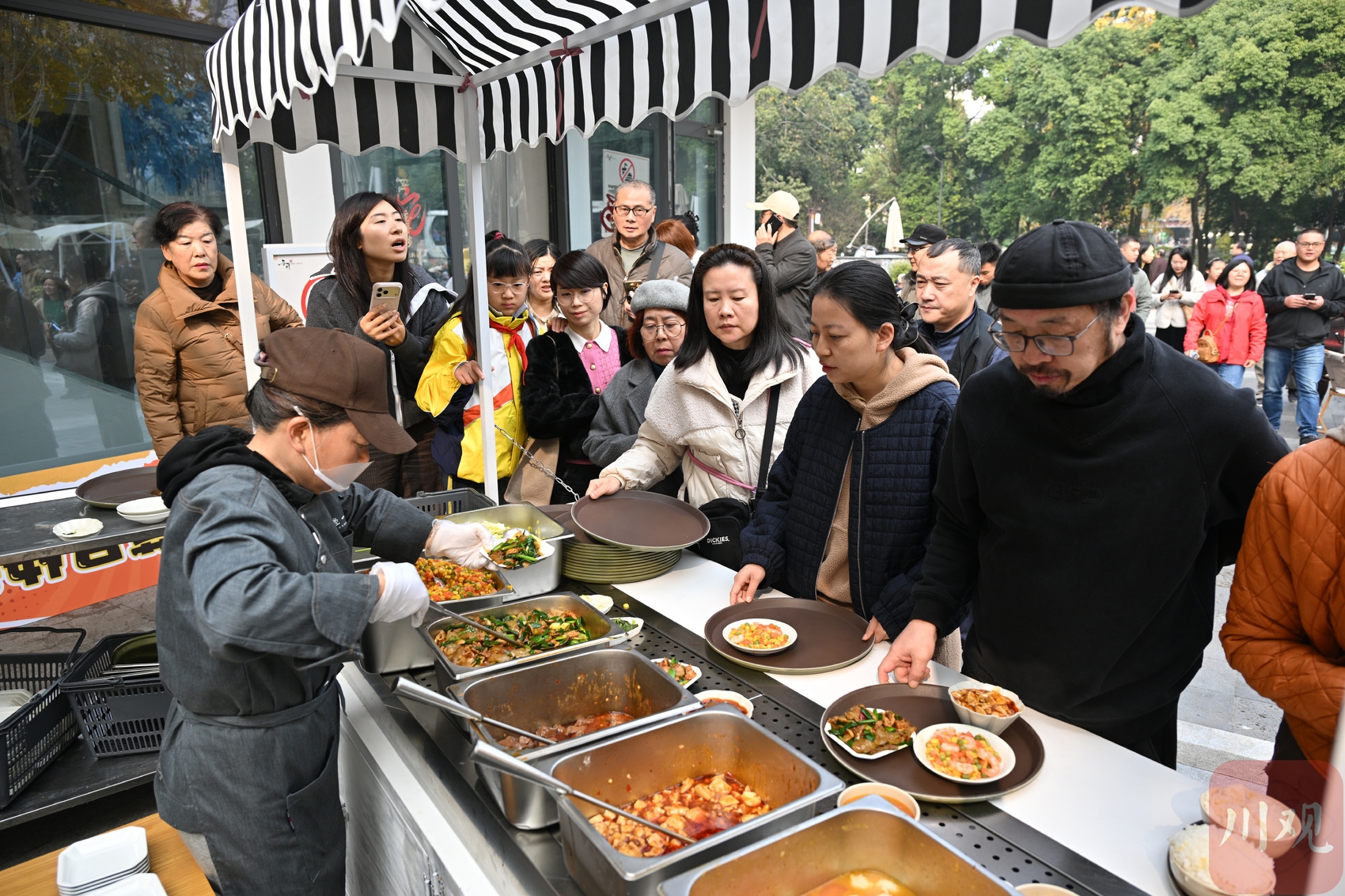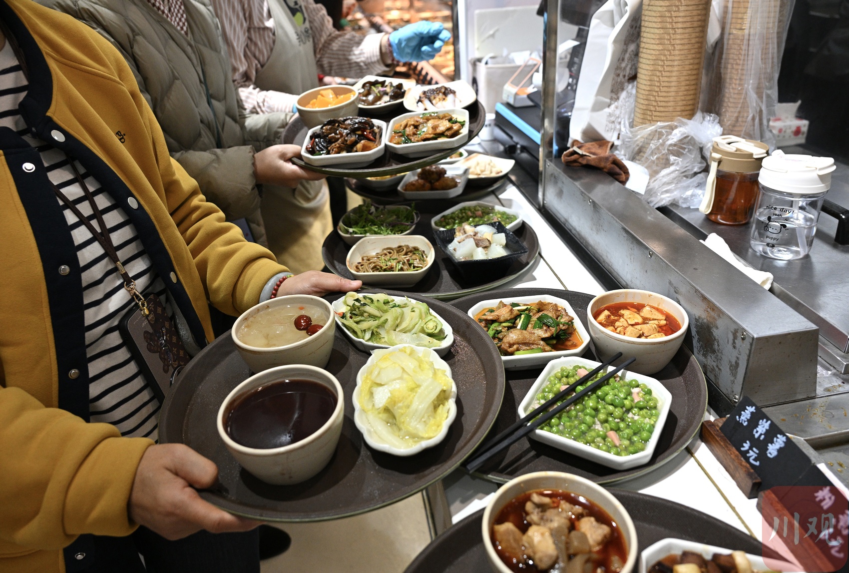 11月29日中午,四川博物院生活体验中心餐厅内人头攒动,60余种小碗菜琳琅满目。川北凉粉、麻婆豆腐、回锅肉等地道川菜热气腾腾,吸引游客排起长龙。