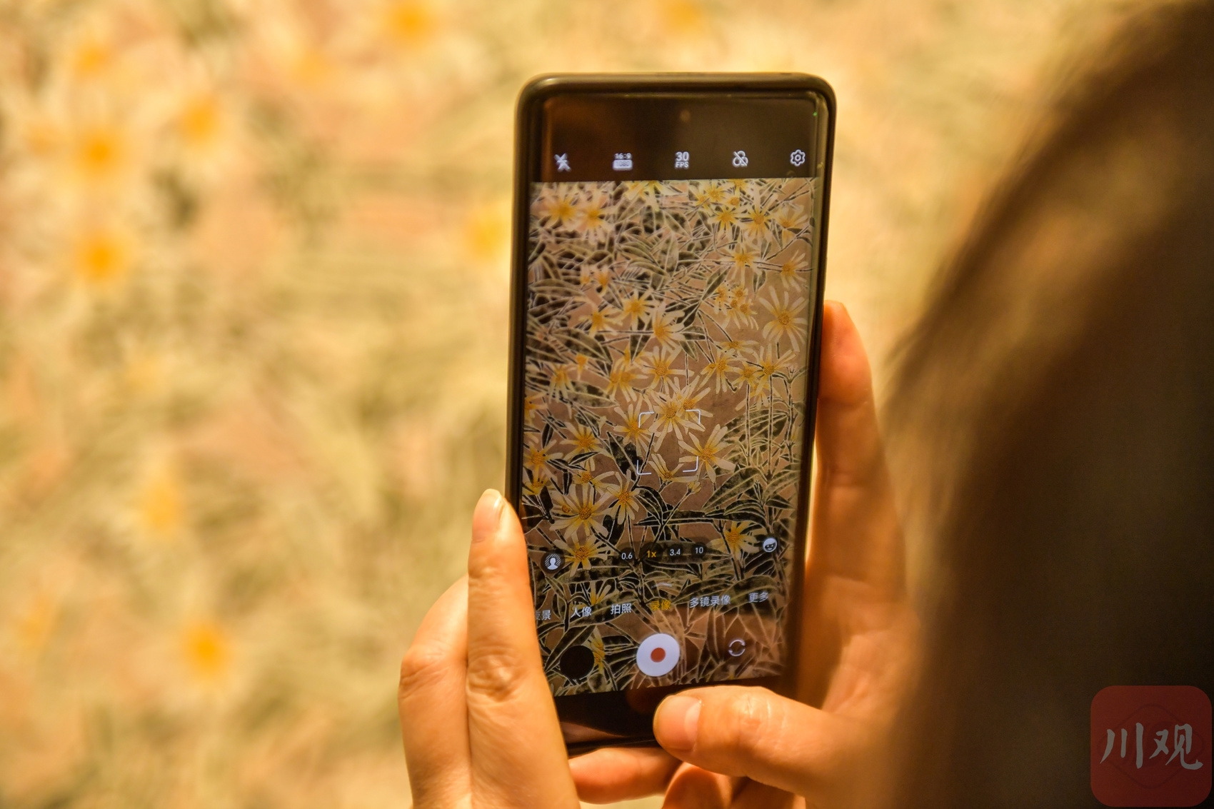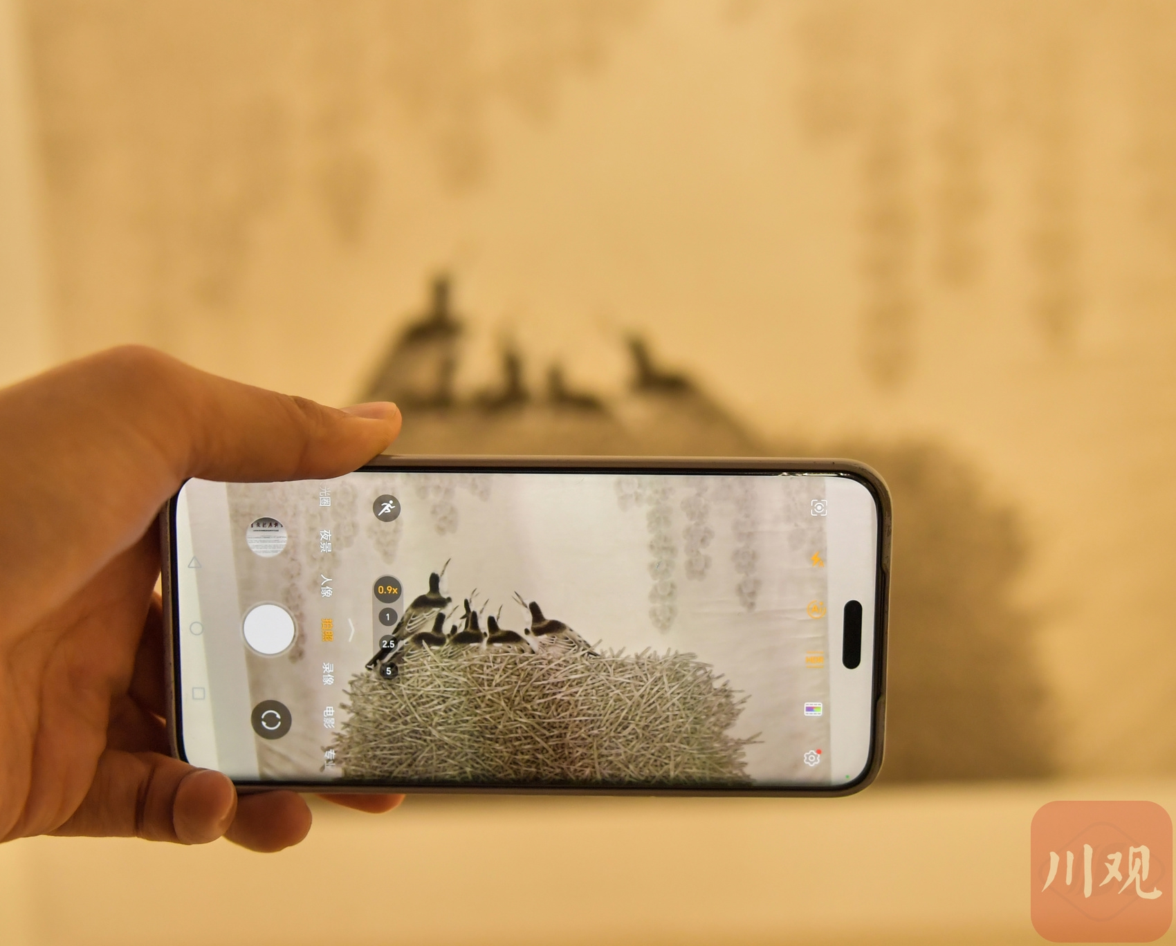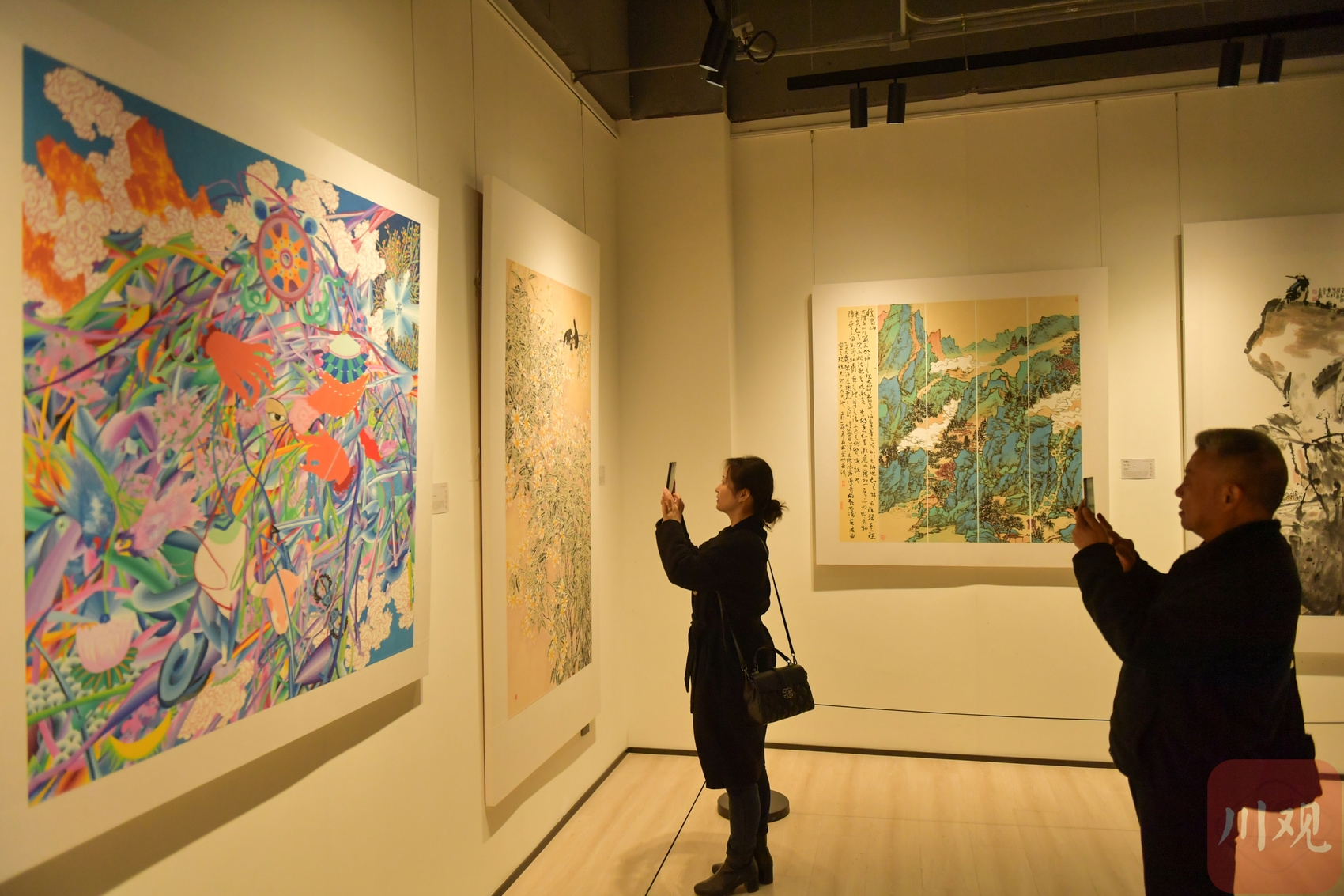 “丹青焕彩 ——四川省国画院换届画家作品展”上展出的国画作品吸引观众拍照记录。