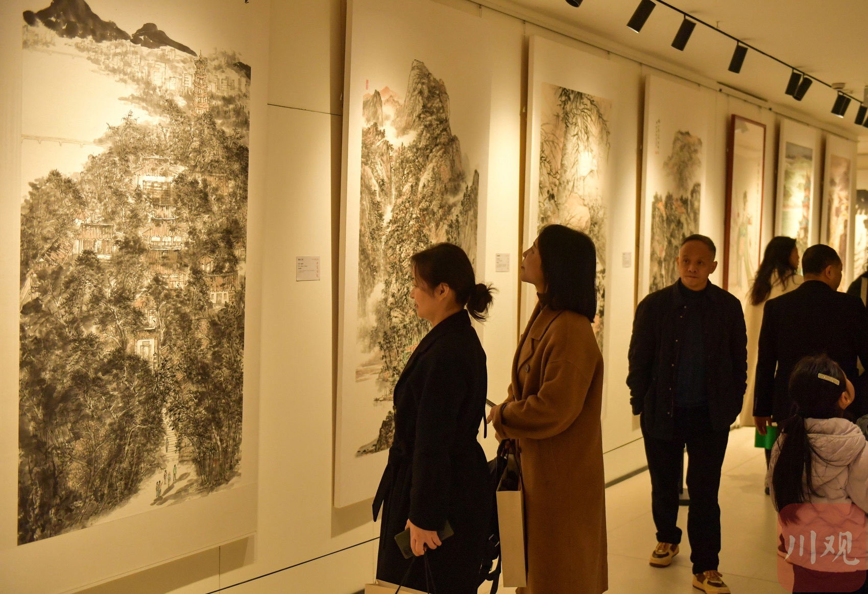 “丹青焕彩 ——四川省国画院换届画家作品展”上展出的国画作品吸引观众观展。