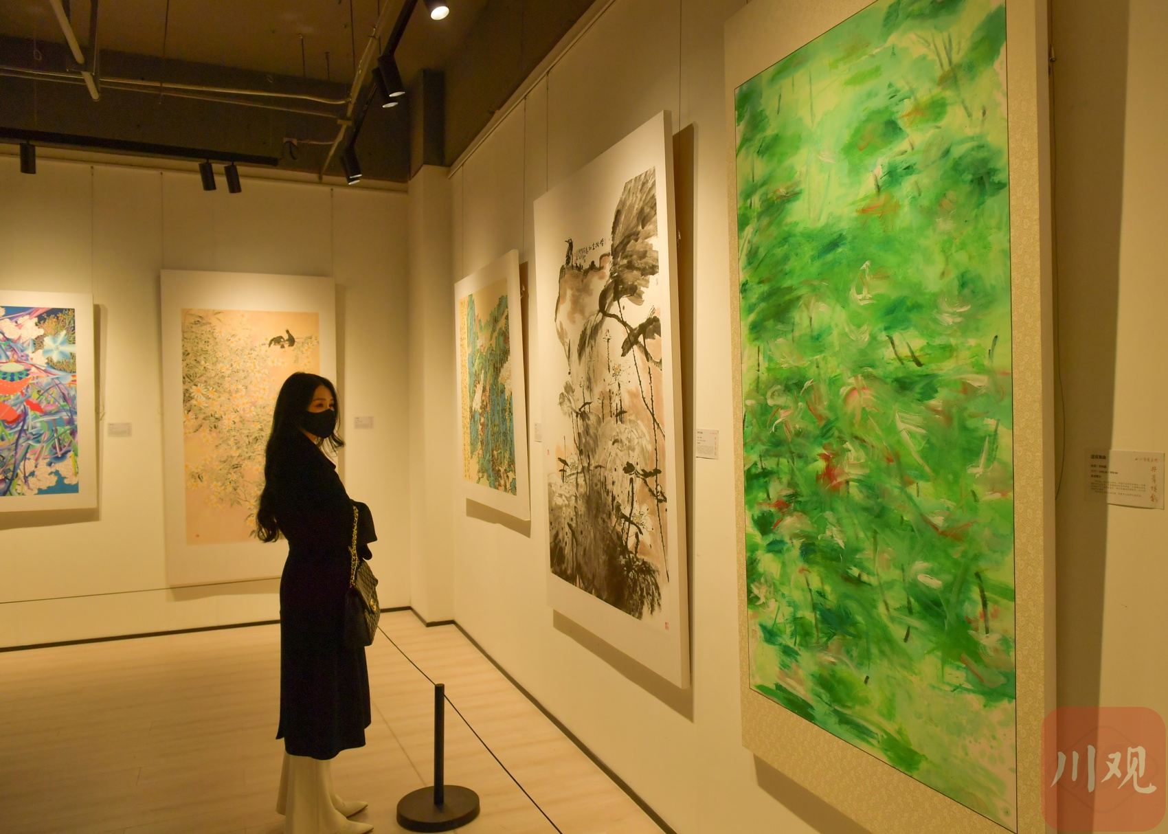 展览现场,山水、花鸟、人物画作题材丰富;工笔、写意、泼彩等技法各异,风格纷呈。从画家龚光万《印象三星堆》的古韵幽思,到 《七彩光雾山》的斑斓秋色;从《天府之国·清荷舞曲》的清新雅致,到《舌尖上的成都》的市井烟火,一幅幅作品构图精妙,笔墨酣畅,将巴蜀大地的自然雄奇与人文风情凝于尺素之间,为观众呈现了一场高品质的艺术盛宴。
