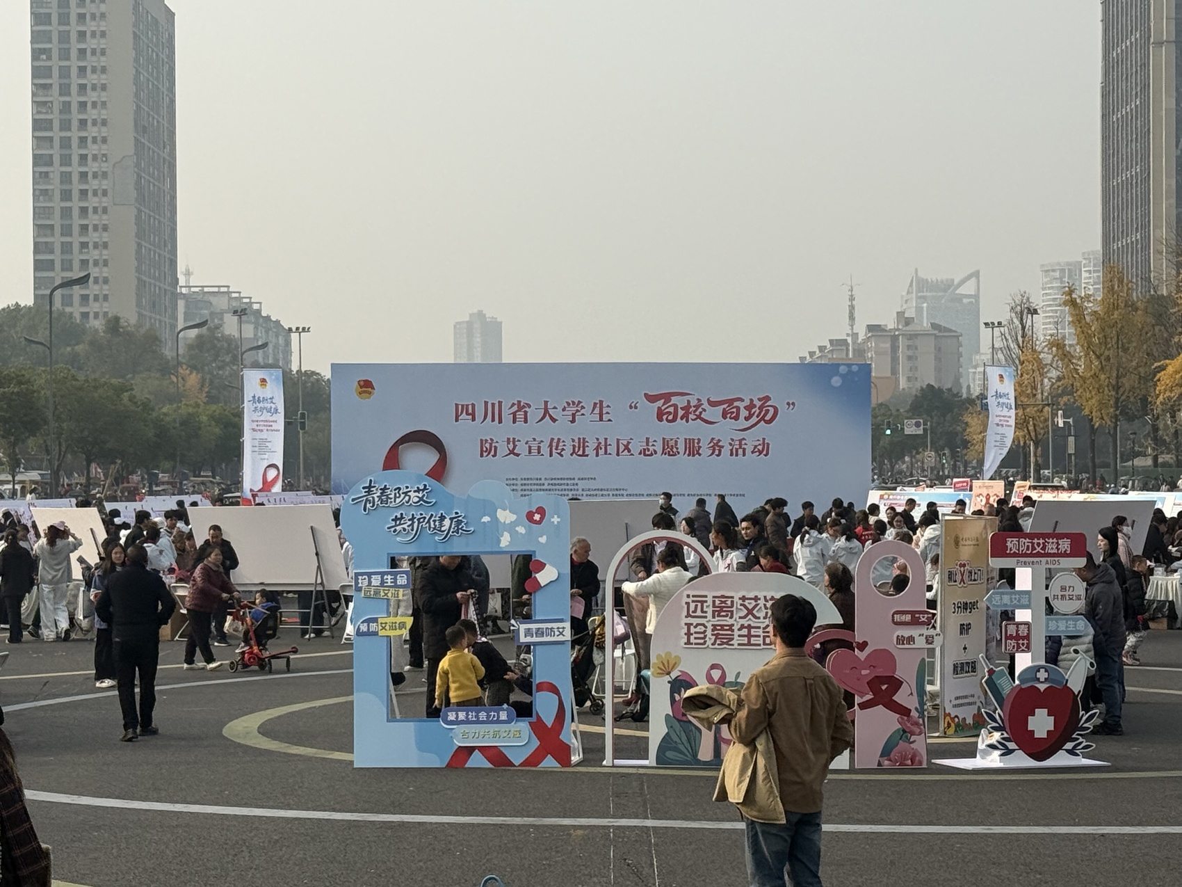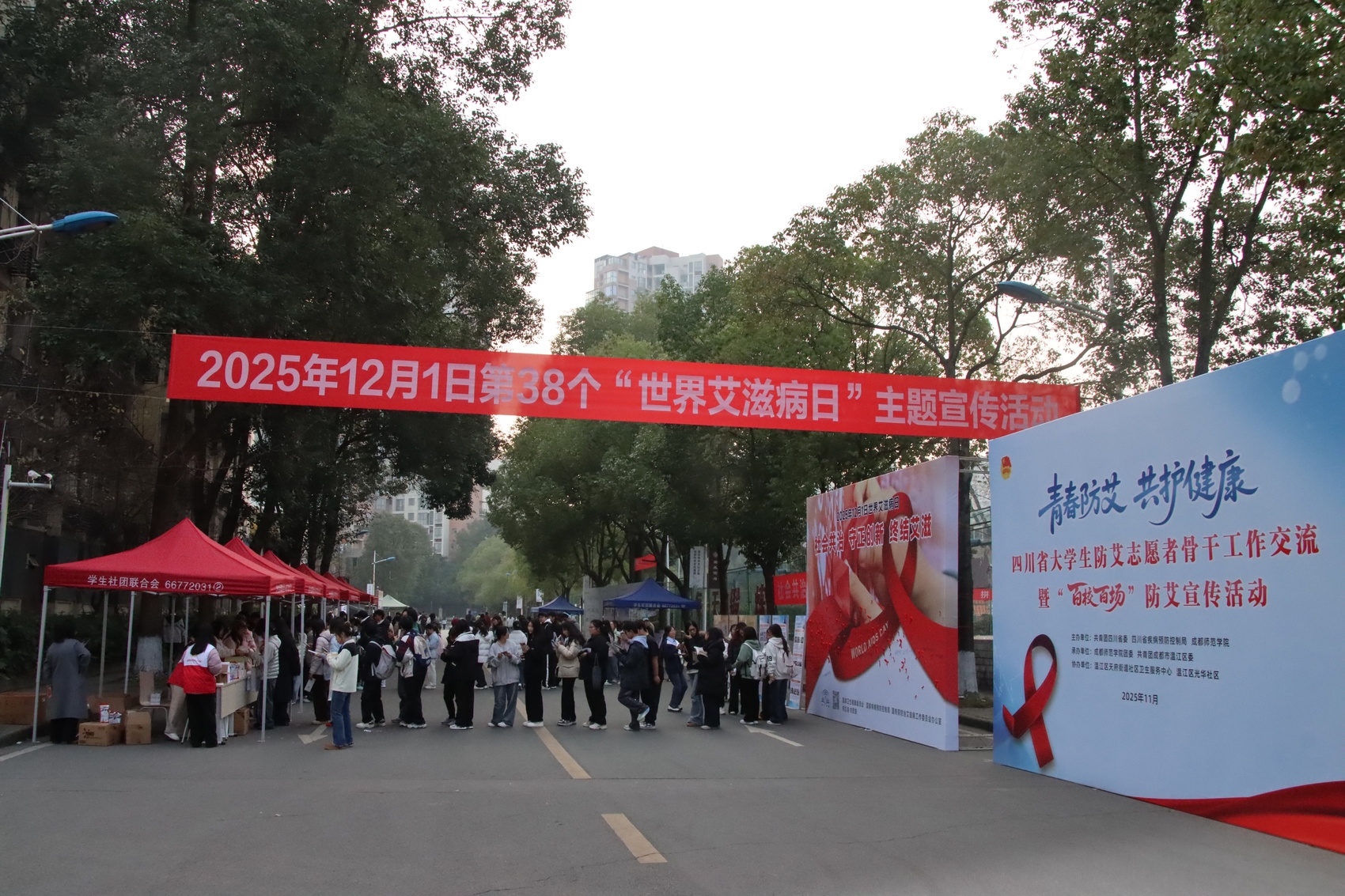 启动仪式上,与会人员观看了防艾宣传片和大学生防艾主题情景剧,志愿服务队代表接受授旗,8名旗手向全体志愿者发出倡议。启动仪式后,大学生志愿者骨干们走进温江区光华社区开展防艾宣传进社区主题志愿服务活动。活动现场设置40余个宣传展位、开展16类互动游戏,通过发放宣传手册、提供健康咨询和诊疗服务等,将防艾知识传递给社区居民,当天累计吸引约5000名群众参与,发放防艾宣传手册4700余册。