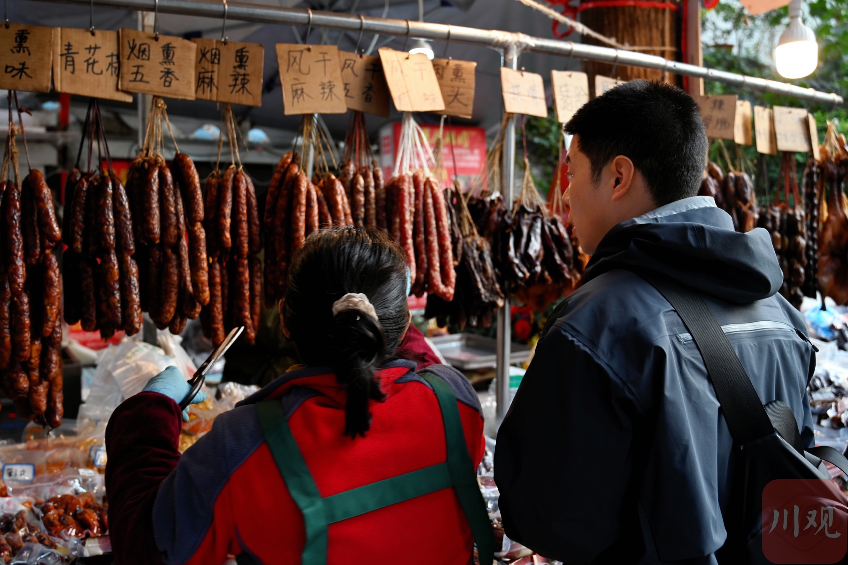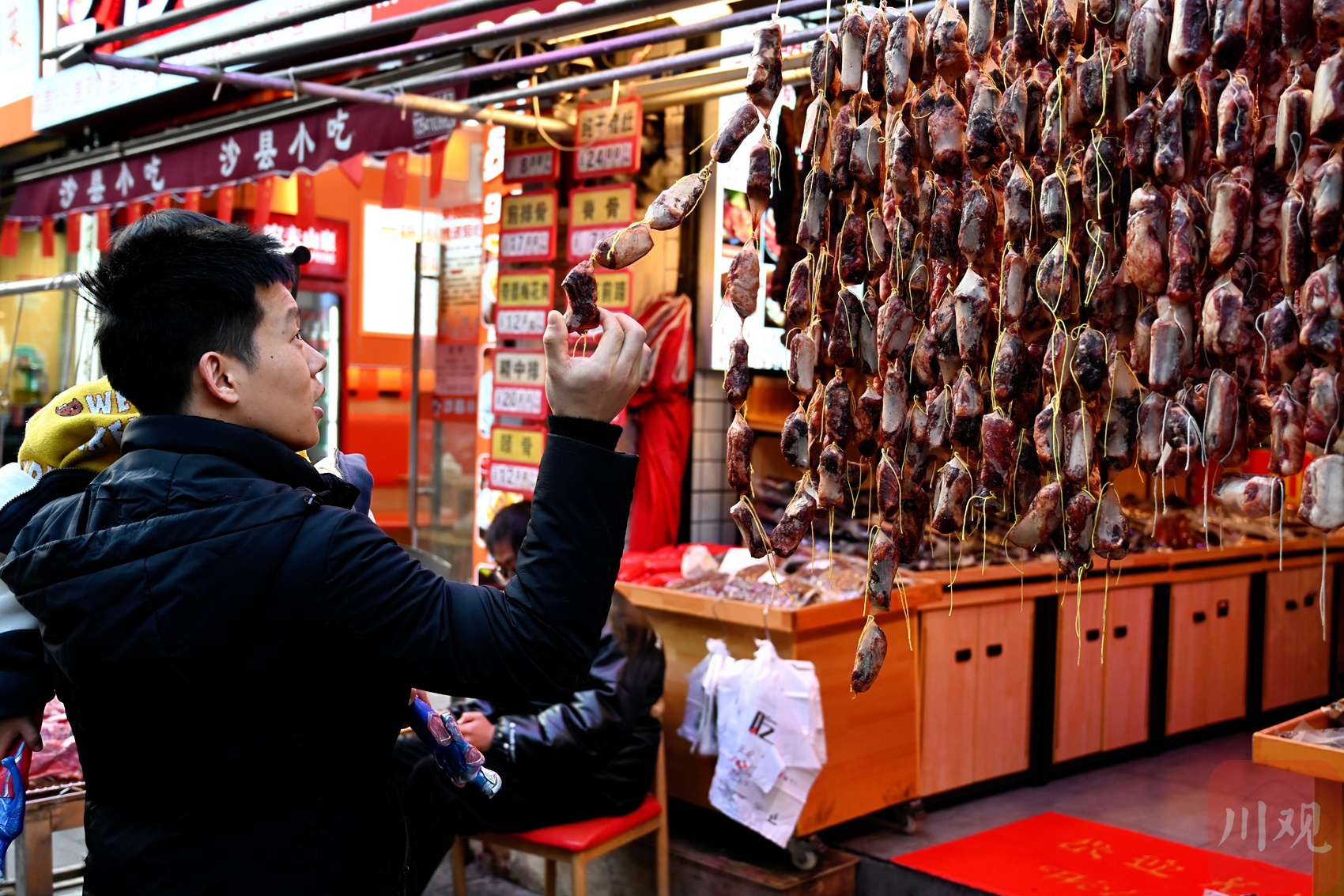 11月30日,在素有“成都香肠腊肉一条街”之称的新开寺街,各家店铺门前已挂满灌制好的香肠。记者从多家商户了解到,目前最受欢迎的仍是川味香肠,售价普遍在每斤35元至38元之间,线上线下销量均十分可观。商家普遍表示,近期天气干燥,非常有利于香肠的晾制,预计冬至之后将迎来一波预订高峰。