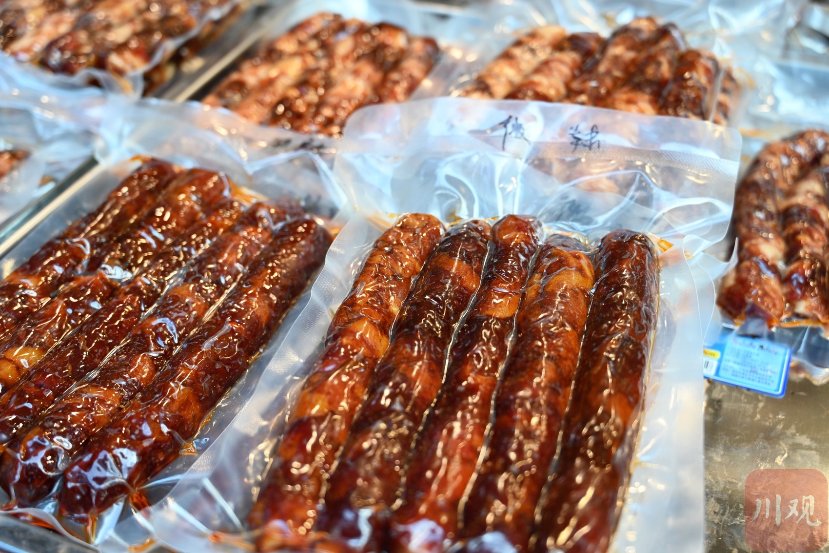 市民在挑选抽真空的香肠