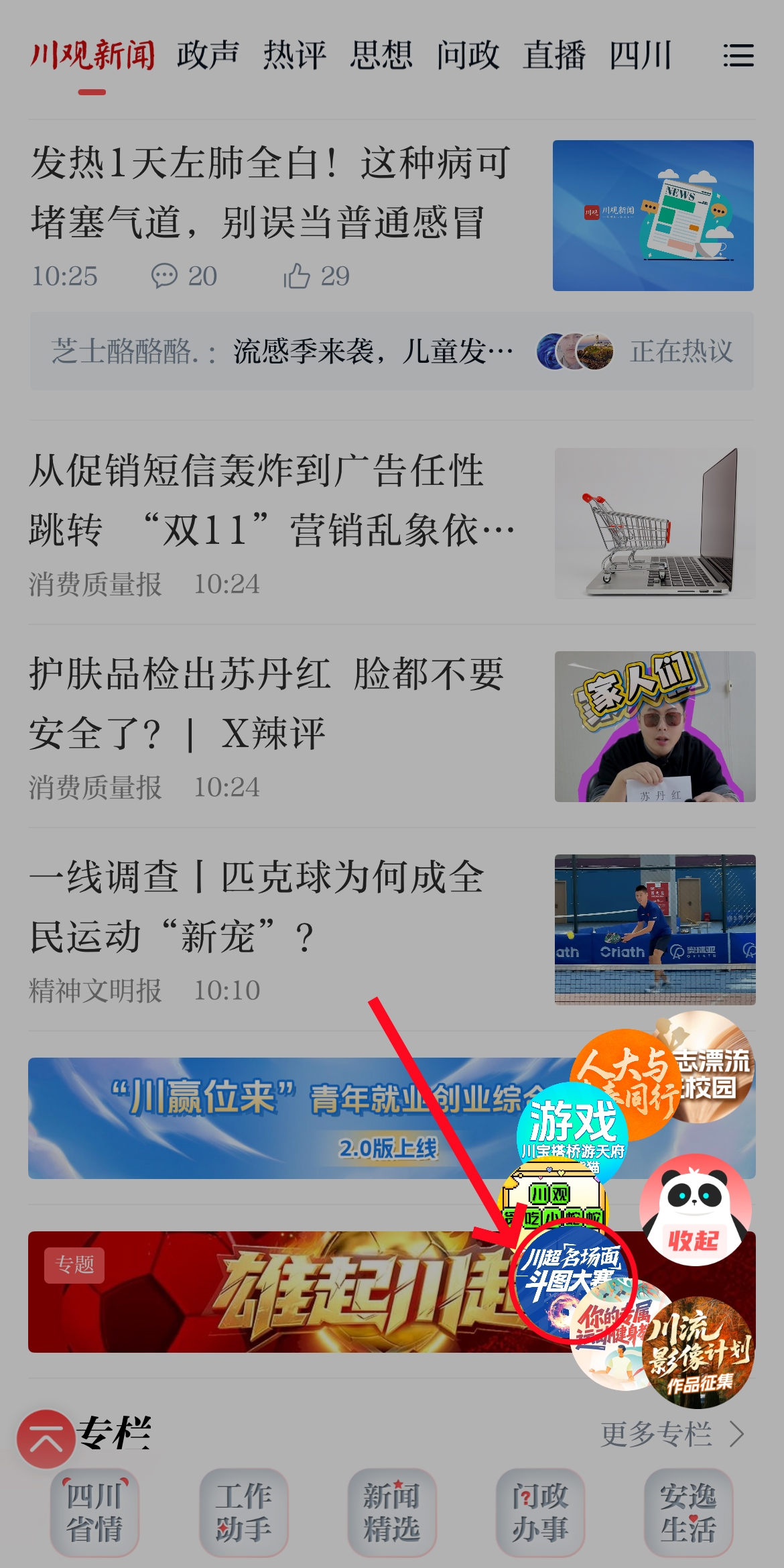 入口一:打开川观新闻App,首页右下角悬浮球选择“斗图大赛”按钮,点击进入活动。