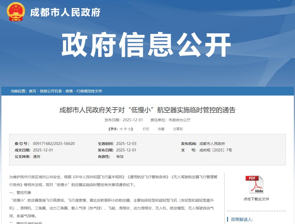 日前,成都市人民政府发布最新通告,对“低慢小”航空器实施临时管控。全文如下: